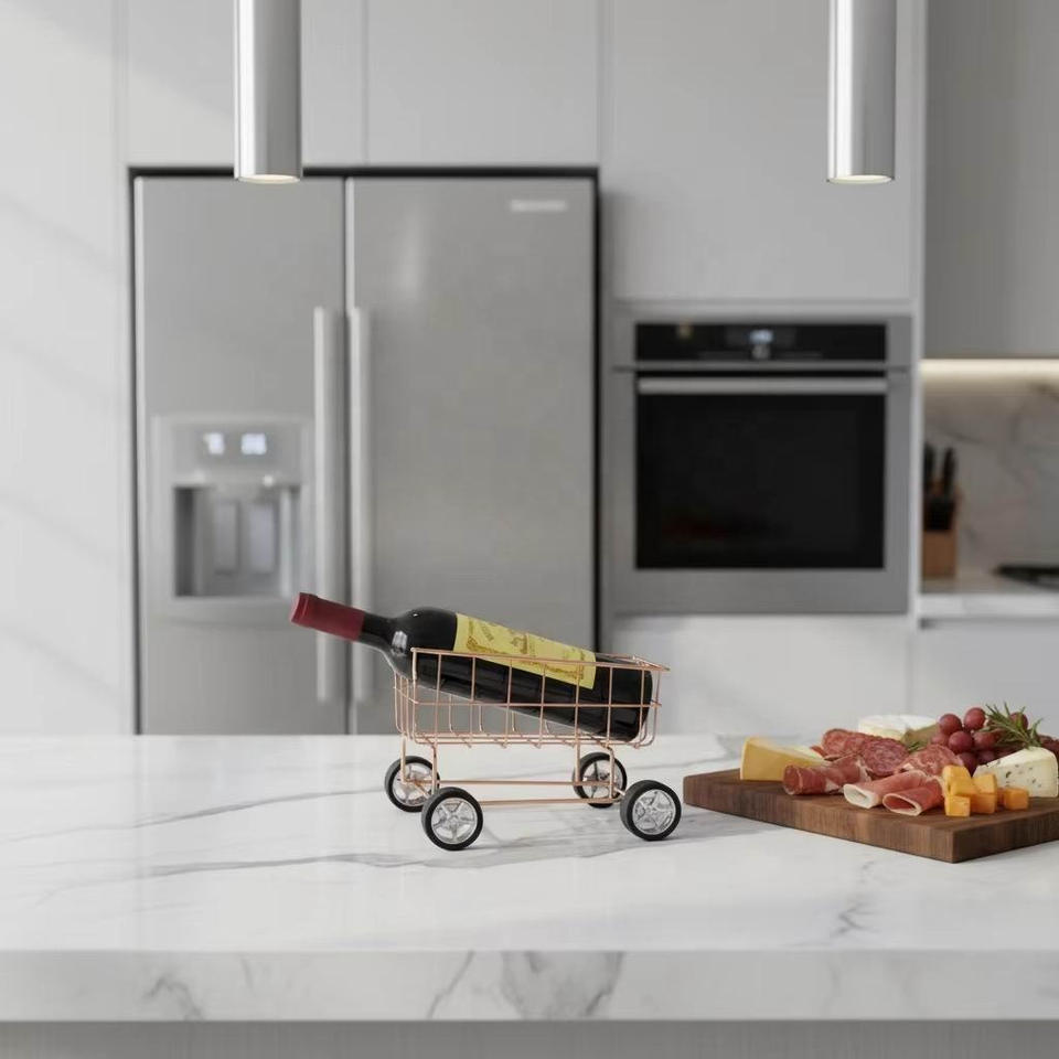 ชั้นวางขวดไวน์โลหะรูปทรงรถเข็นช็อปปิ้ง ที่วางขวดไวน์โลหะ ชั้นวางไวน์