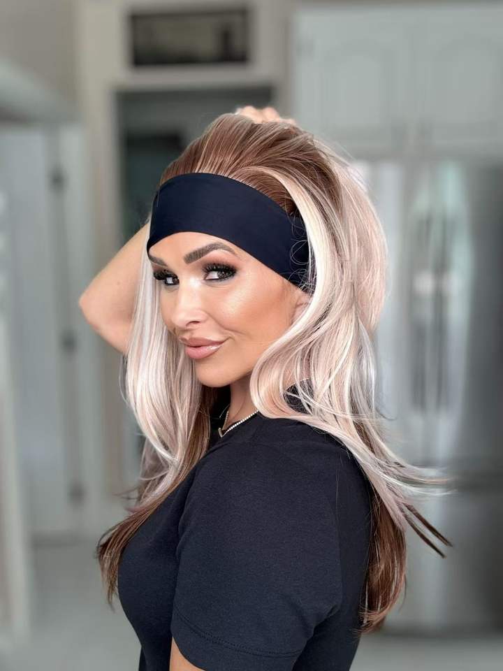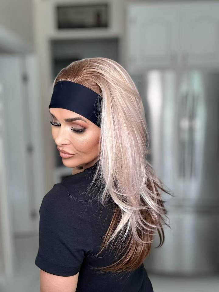 วิกผมสั้นแบบมีเลเยอร์สีบลอนด์ตรง พร้อมที่คาดผมลูกไม้สีน้ำตาลใส วิกผมสังเคราะห์คุณภาพพรีเมียม เนื้อไหมนุ่ม สำหรับผู้หญิง ใช้ได้ทุกวัน