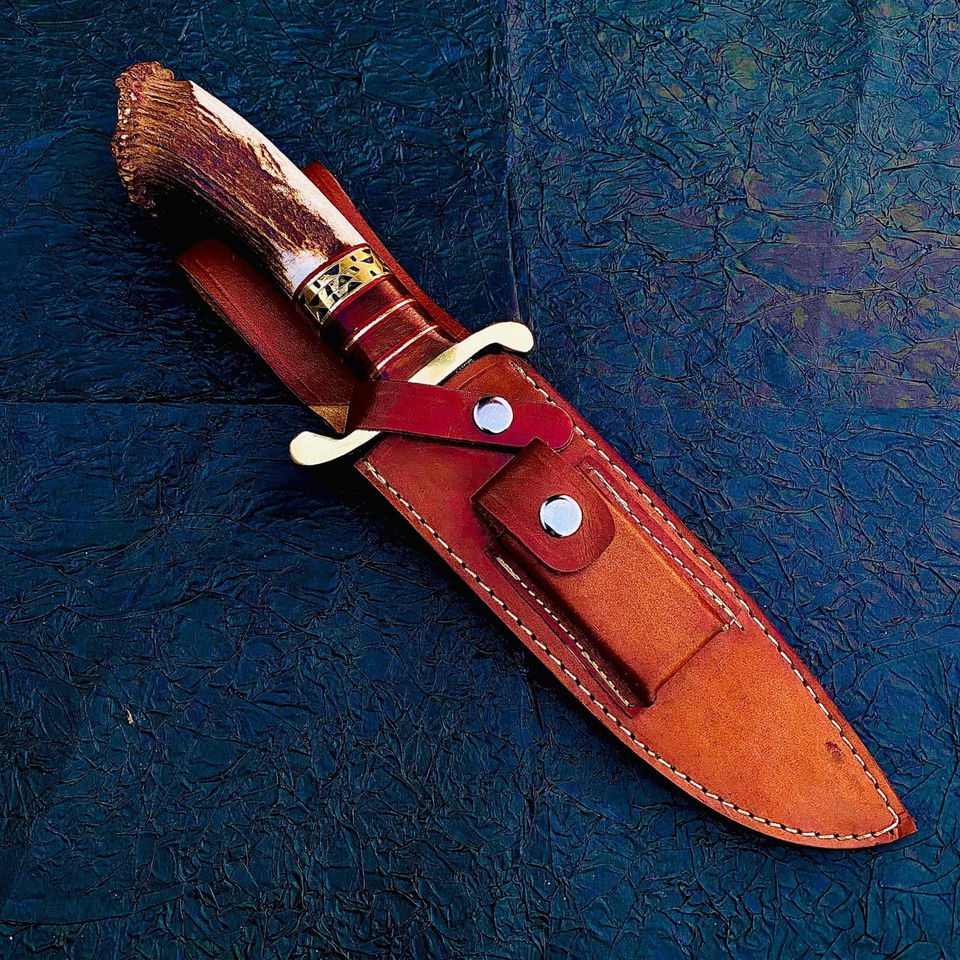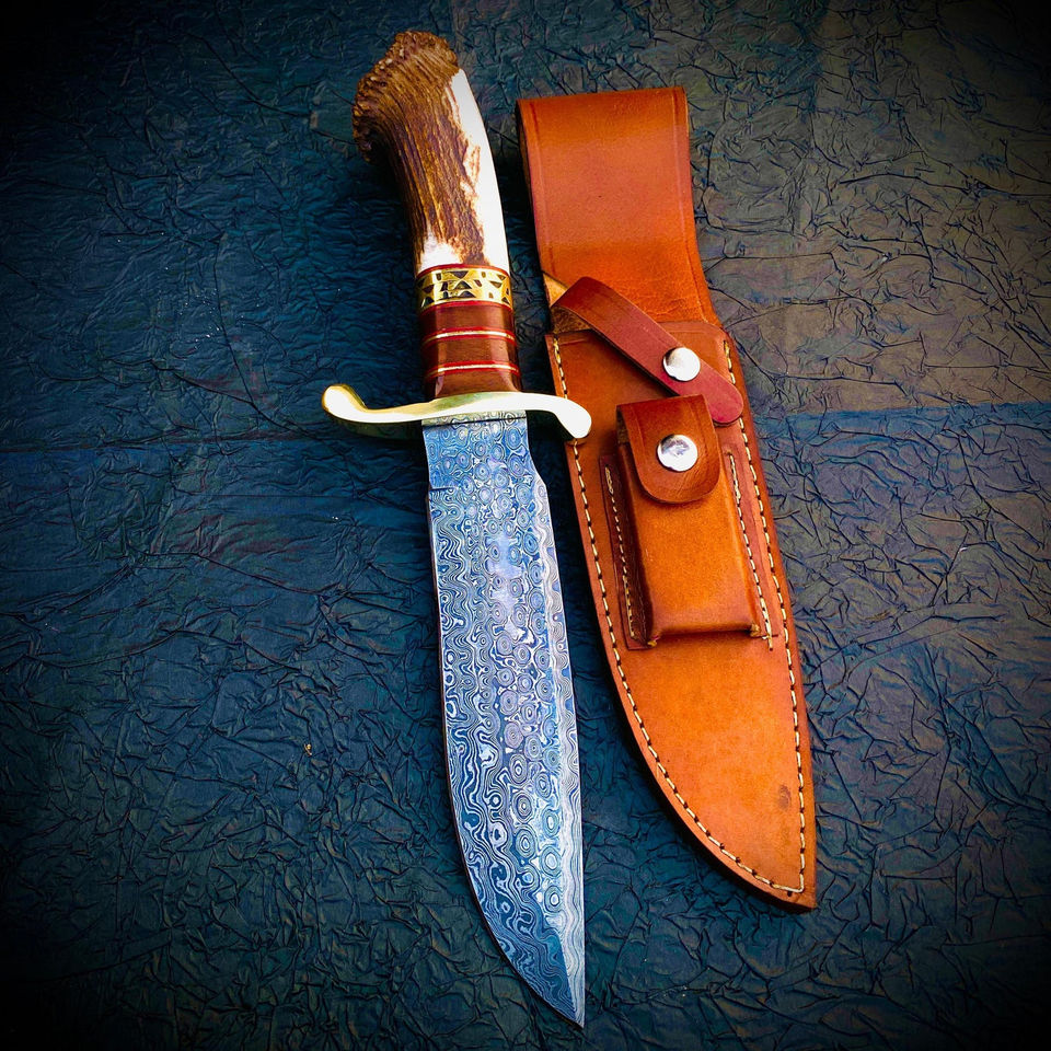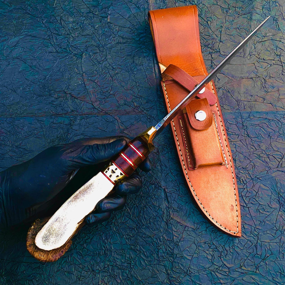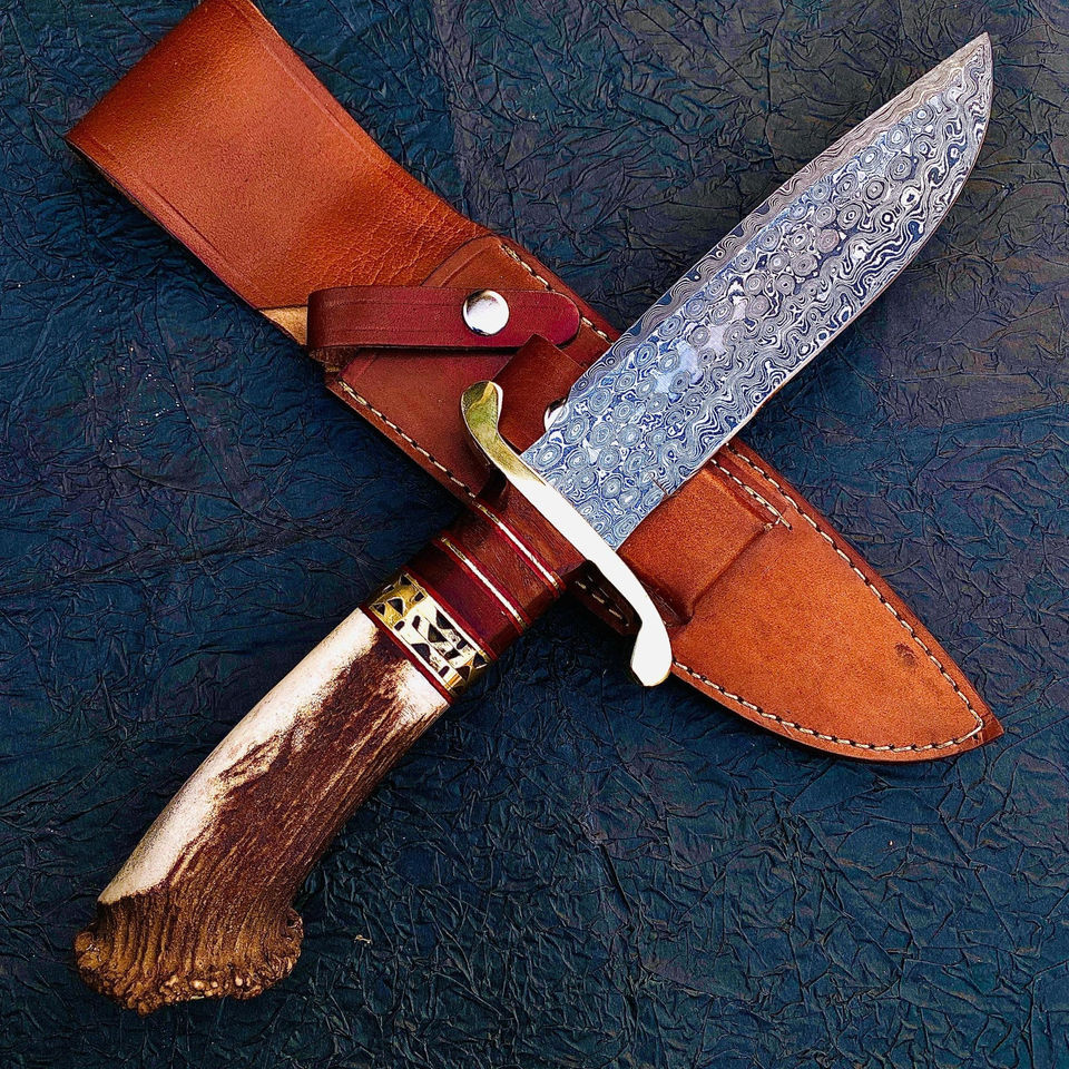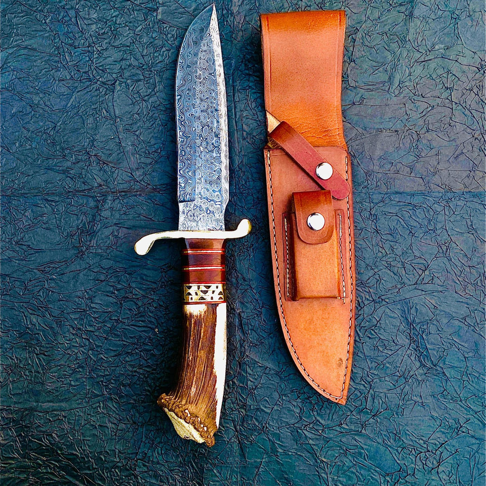 มีดสั้นเหล็กดามัสกัสทรงตรงสำหรับล่าสัตว์ คุณภาพอุตสาหกรรม ด้ามทำจากเขากวาง พร้อมปลอกหนัง แบบพกพา สำหรับใช้งานทางยุทธวิธี (OEM)