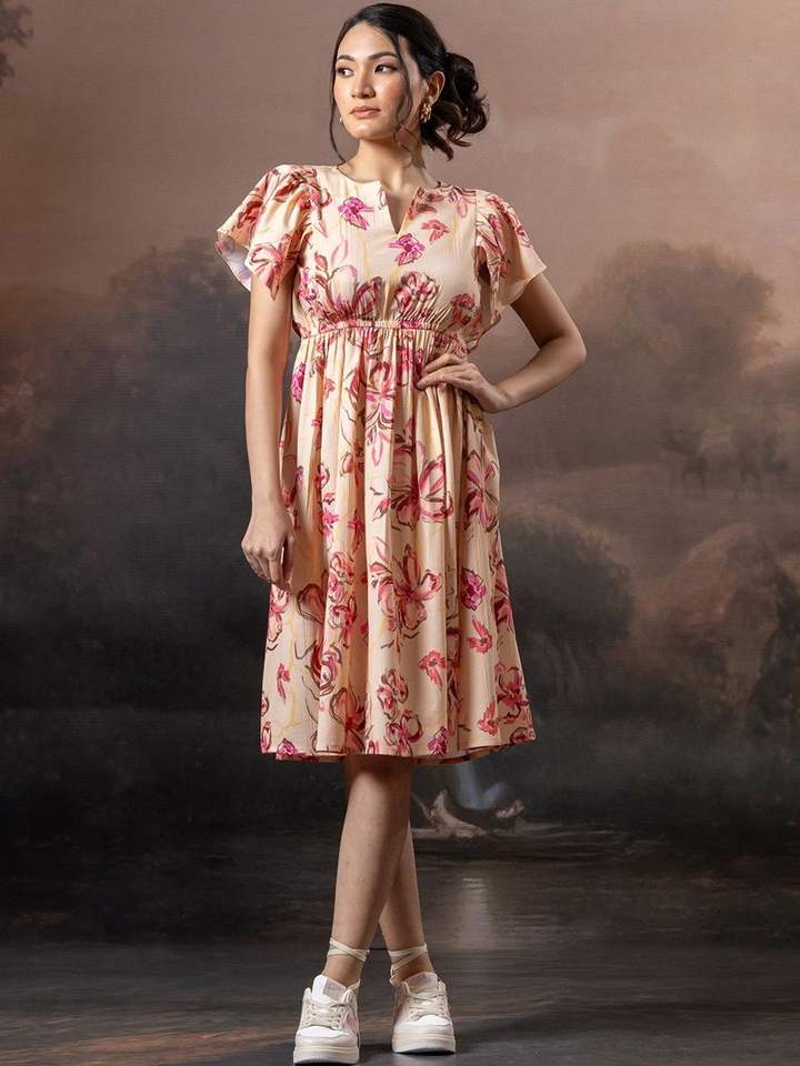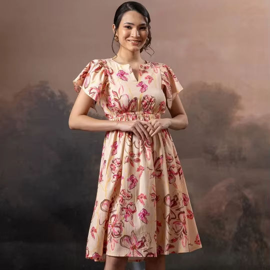 เดรสแขนสั้นคอวีลึก แขนระบายทรงเอ กระโปรงระบายชาย ยาวปานกลาง สีชมพูคอรัล ลายดอกไม้ ผูกเอว ช่วงเอวธรรมชาติ