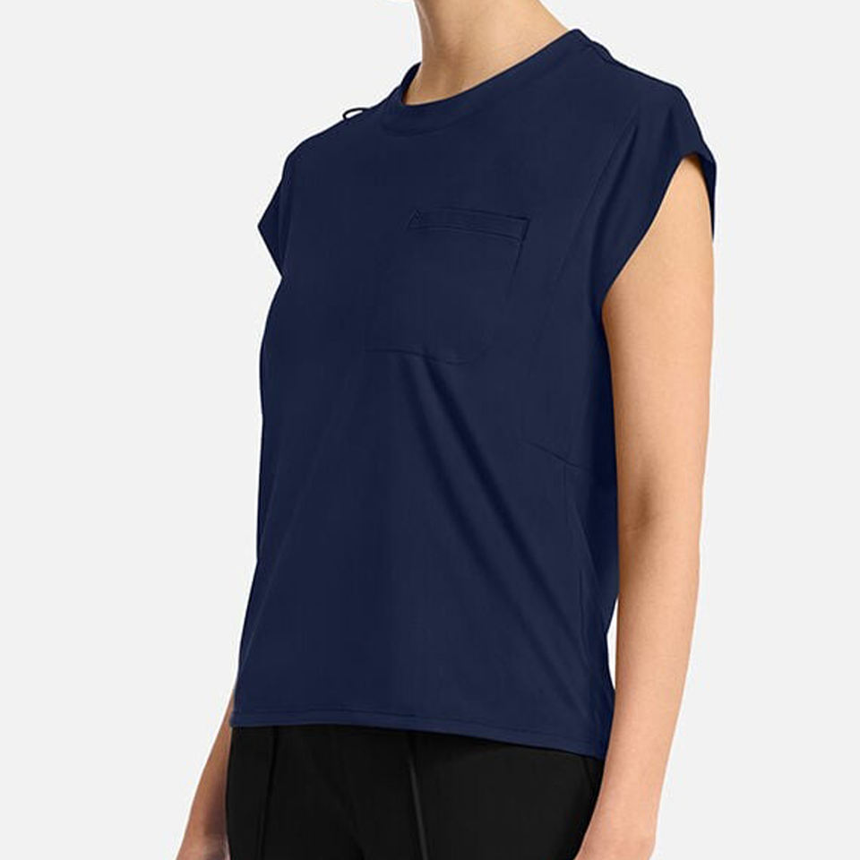 เสื้อสแปนเด็กซ์แขนสั้นสำหรับสตรีผ้าสแปนเด็กซ์แขนสั้นมีกระเป๋าหน้าอกเสื้อคอลูกเรือสีกรมท่า