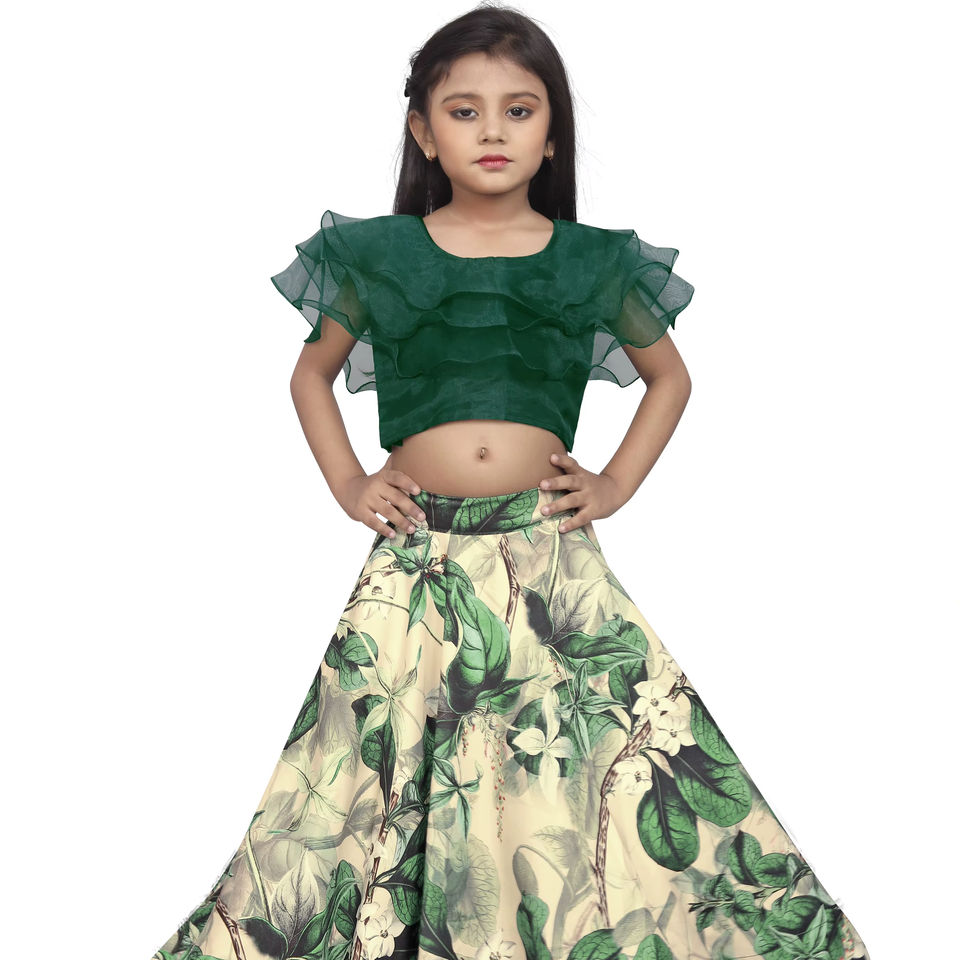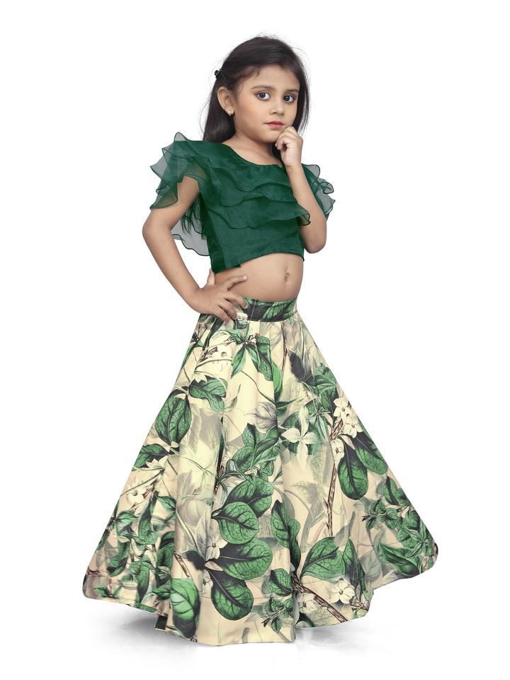 ชุดเสื้อผ้าเด็กแฟชั่น Shoryam เสื้อระบายสีเขียว กระโปรงพิมพ์ลาย ชุดเลเฮนกาโชลีแบบอินเดียดั้งเดิมสำหรับเด็กผู้หญิง เหมาะสำหรับงานปาร์ตี้