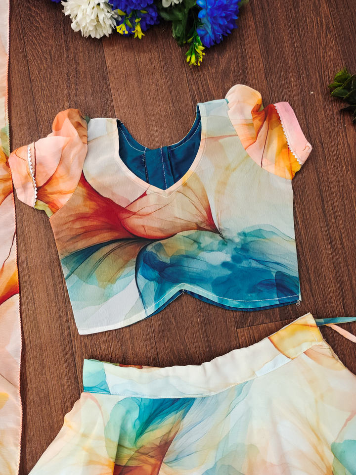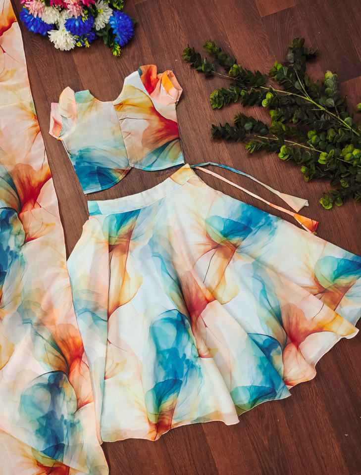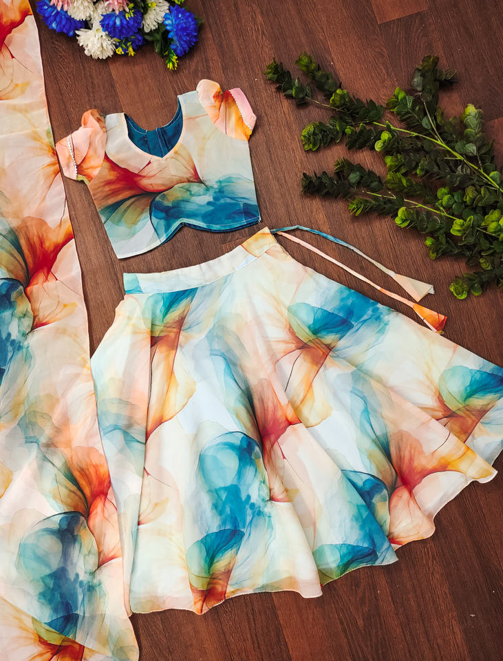 ชุดเลเฮนกาโชลีลายดอกไม้แบบนามธรรมสำหรับเด็กผู้หญิง แบรนด์ชอริยัม แฟชั่น ดีไซน์เนอร์ ลายพิมพ์ดิจิทัล เสื้อผ้าชาติพันธุ์ ชุดออกงาน 3 ชิ้น ยาวคลุมเท้า
