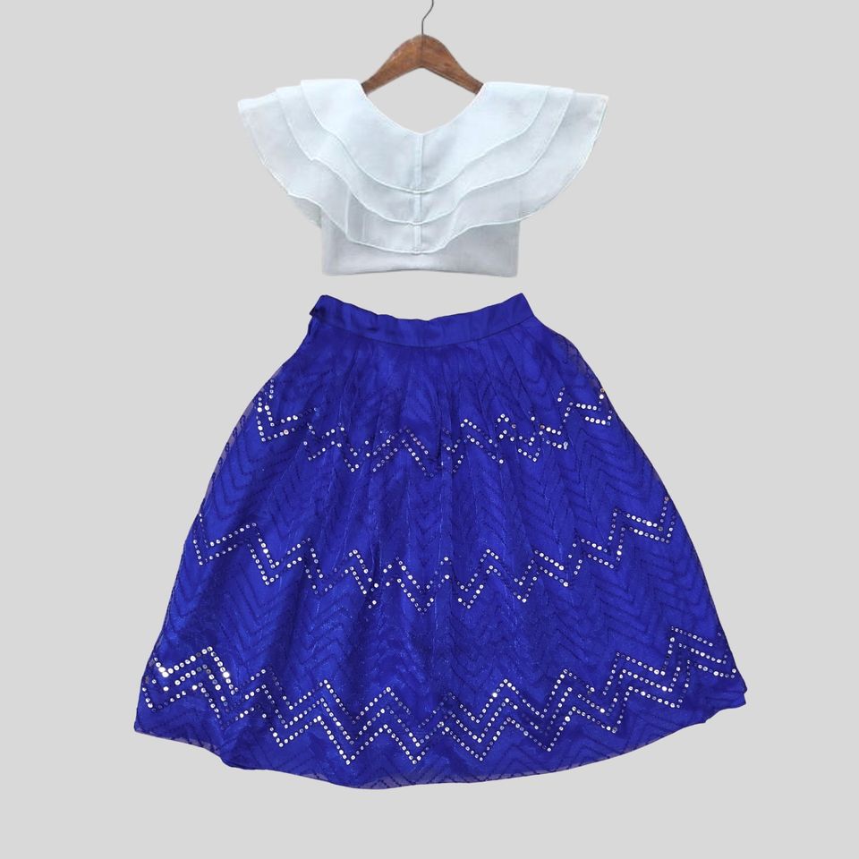 ชุดเลเฮนกาโชลีสีน้ำเงินประดับเลื่อมยาวกรอมพื้นสำหรับเด็กผู้หญิงสไตล์ชาติพันธุ์จาก Shoryam Fashion | เสื้อเบลาส์แขนซ้อนสีขาวหรูหราปักลาย