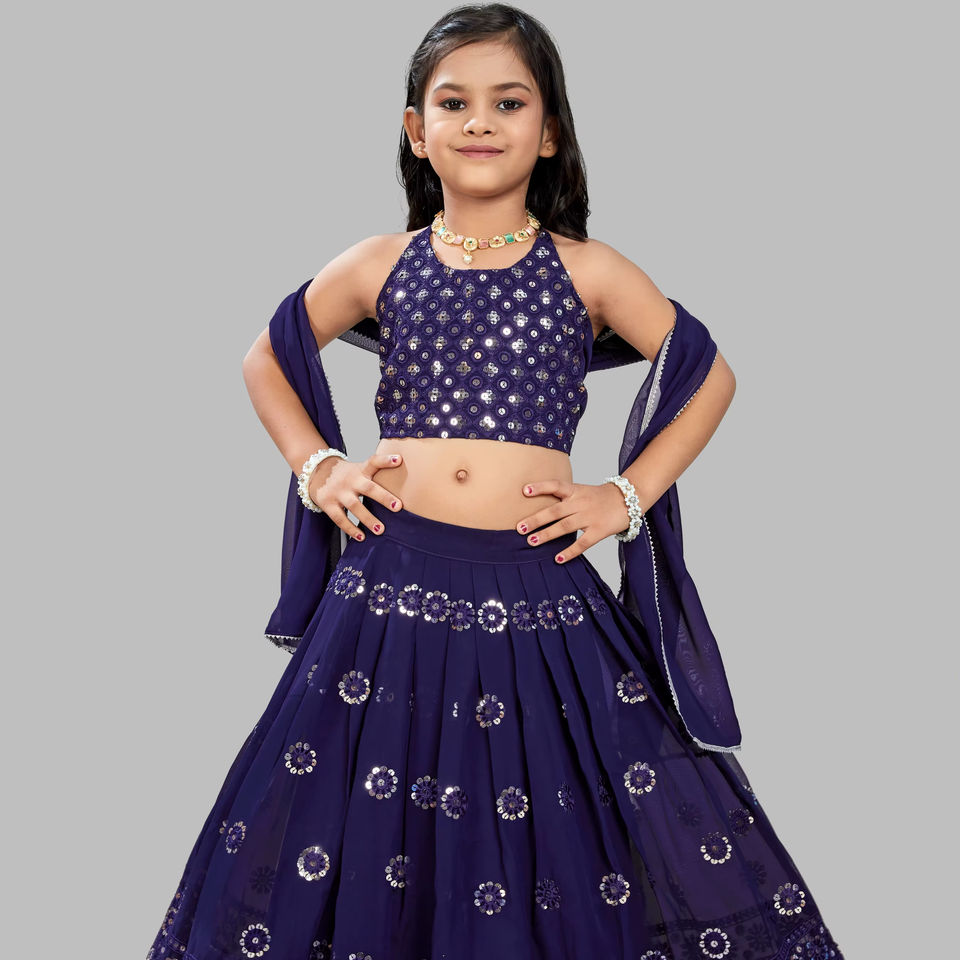 ชุดเลเฮนกาโชลีสีน้ำเงินกรมท่าสำหรับเด็กผู้หญิง แบรนด์โชรยัม แฟชั่น ทำจากผ้าจอร์เจตต์ ยาวถึงพื้น ตัดเย็บสำเร็จ พร้อมงานปักและประดับเลื่อม พร้อมผ้าคลุมไหล่; ชุดประจำชาติ