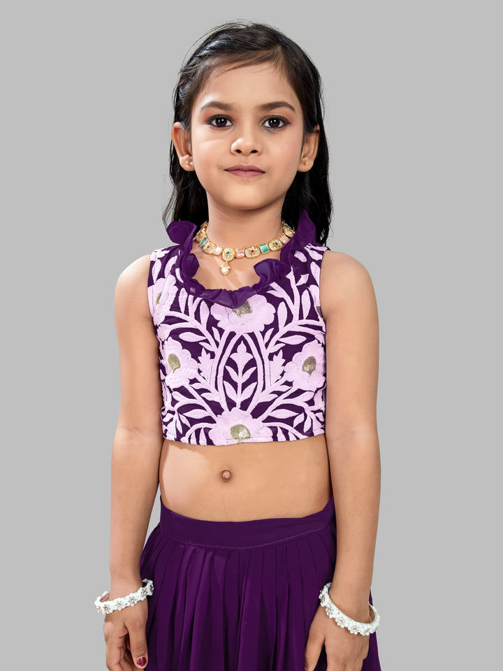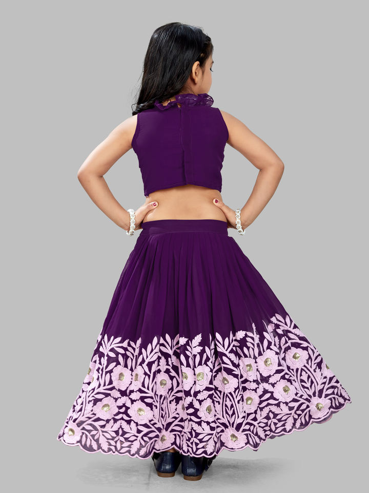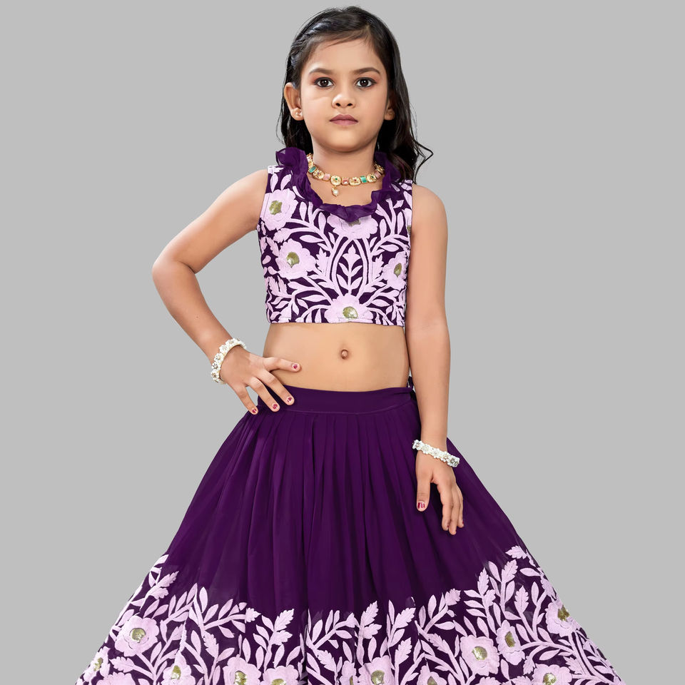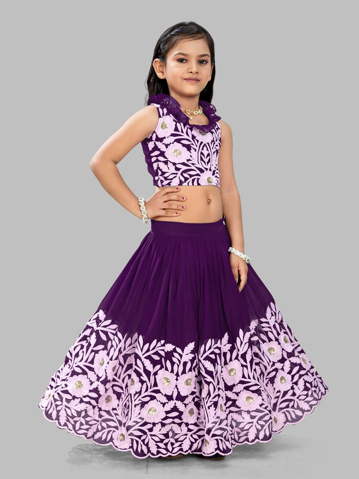 ชุดเลเฮนกาโชลีสีม่วงสำหรับเด็กผู้หญิง แบรนด์โชรยัม แฟชั่น ตกแต่งด้วยลายปักดอกไม้ คอระบาย แต่งสไตล์ชาติพันธุ์ เหมาะสำหรับงานปาร์ตี้ ความยาวระดับพื้น