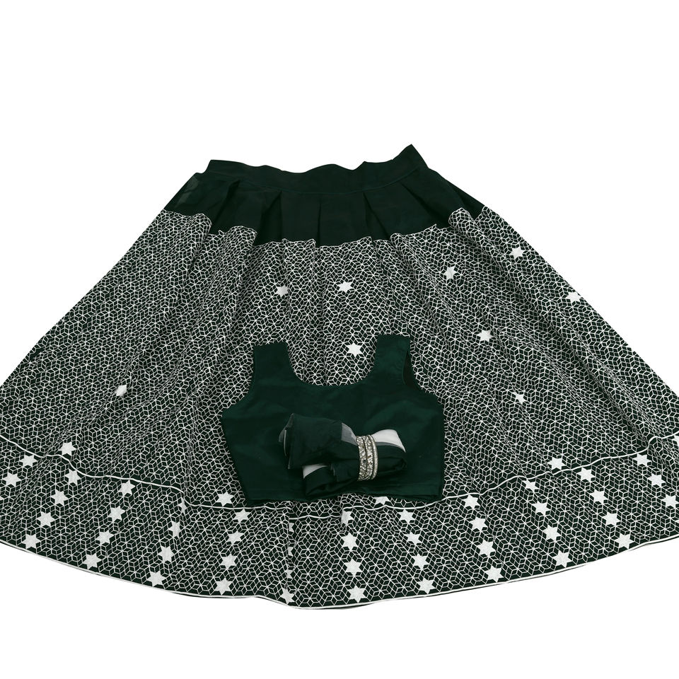 ชุดแฟชั่นเด็กผู้หญิงแบบดั้งเดิมสีเขียว กากราโชลี แขนกุด ลายดาวสีขาว พิมพ์ลายฟอยล์ กระโปรงยาวลากพื้น