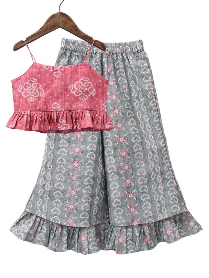 ชุดเสื้อครอปสายเดี่ยวพิมพ์ลายแบนดานีสีชมพูของ Shoryam Fashion พร้อมกางเกงชาราราสีเทาสำหรับเด็กผู้หญิง ชุดแบบดั้งเดิมของอินเดีย เหมาะสำหรับงานปาร์ตี้ พร้อมสวมใส่
