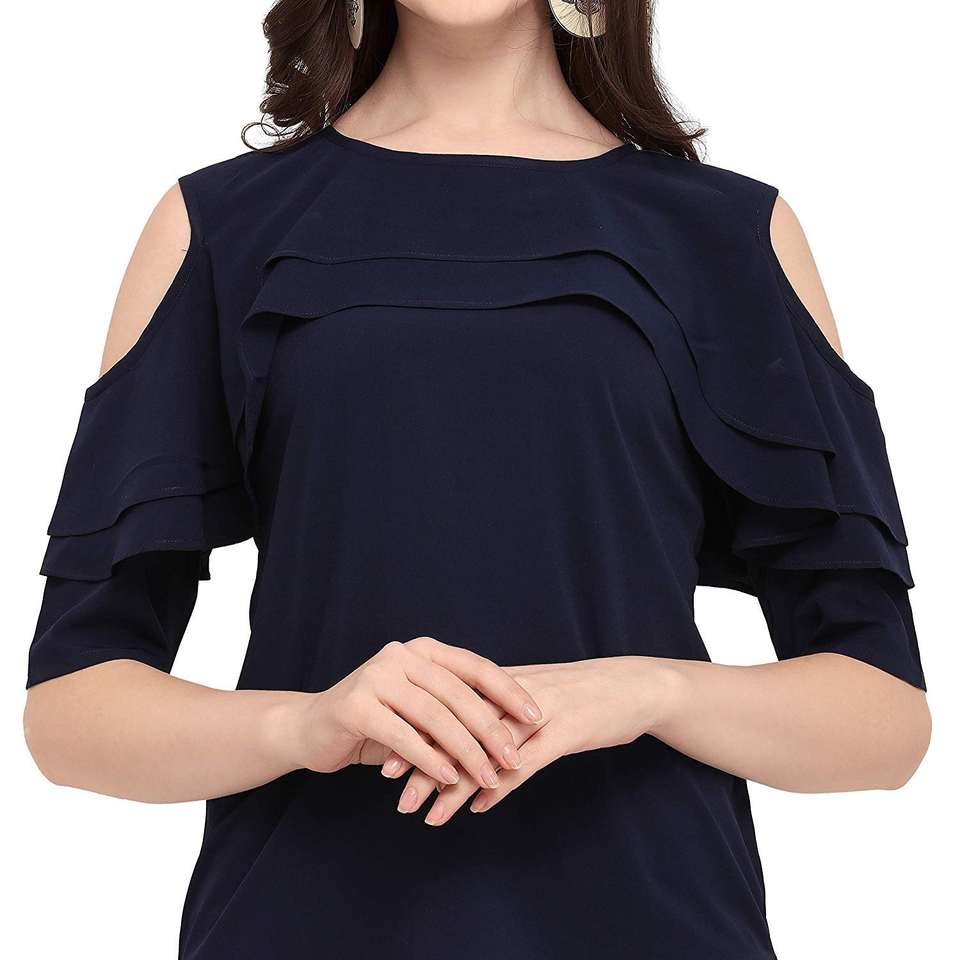 เสื้อแฟชั่นผู้หญิง Shoryam สีน้ำเงิน แบบเปิดไหล่ แต่งระบาย สไตล์ทางการแบบตะวันตก เสื้อยืดดีไซน์เนอร์ผ้าเครป แห้งเร็ว