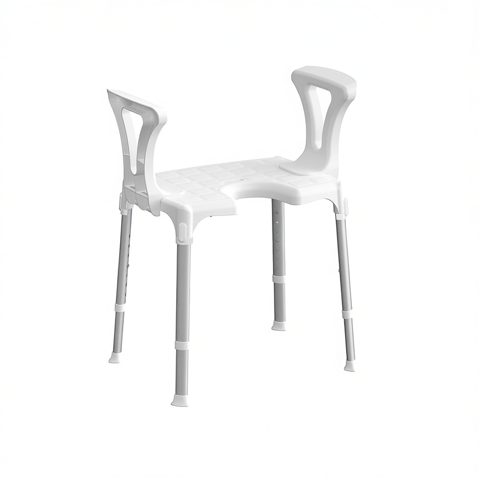 เก้าอี้อาบน้ำมีที่วางแขน สีขาว ยาว 55 ซม. ปรับความสูงได้ ใช้ในโรงพยาบาล