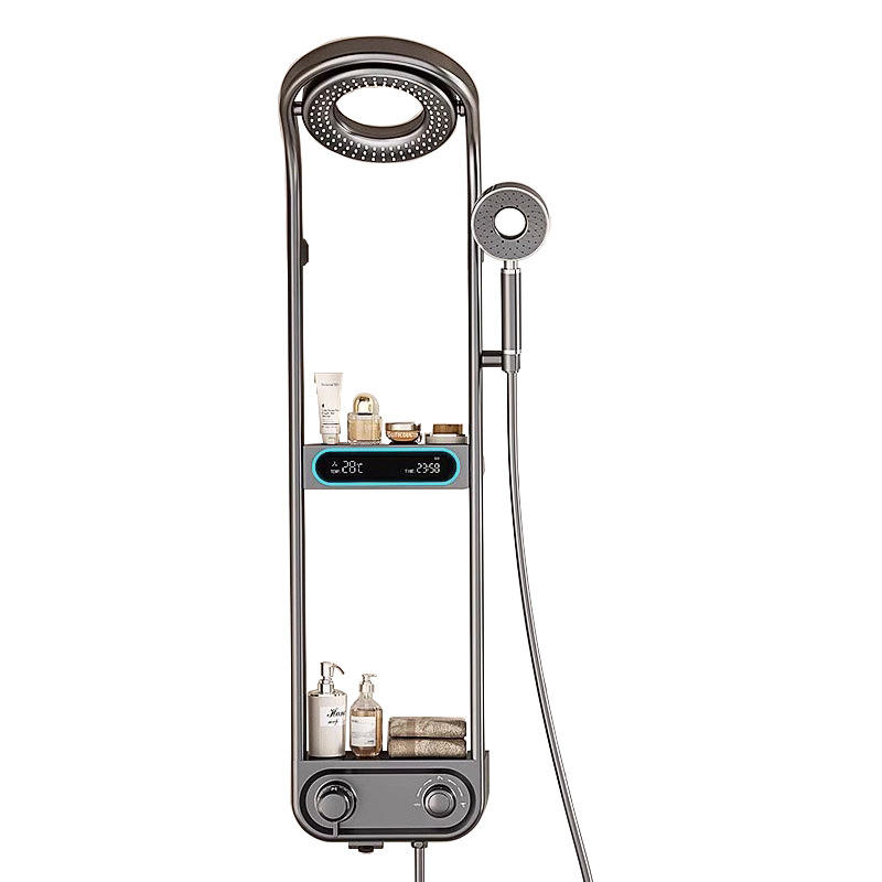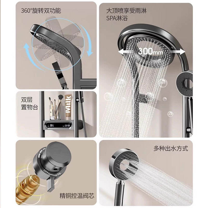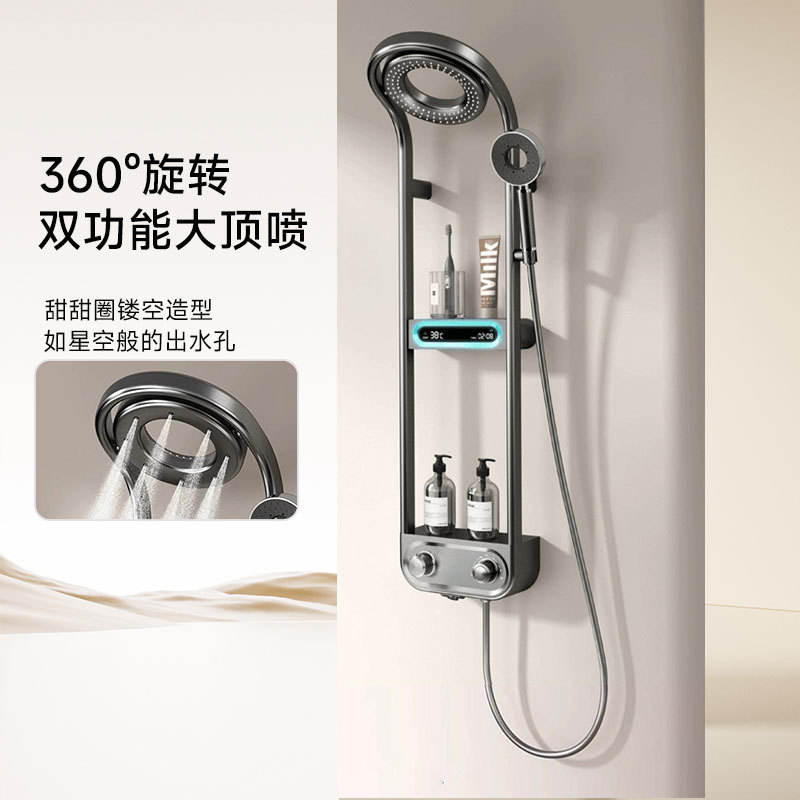 ชุดฝักบัวอาบน้ำแบบสองชั้น พร้อมที่เก็บของ ควบคุมอุณหภูมิแบบดิจิตอล สีเทากันเมทัล หัวฝักบัวทรงโดนัททองแดงทั้งหมด แบบฝังผนัง สำหรับห้องน้ำ