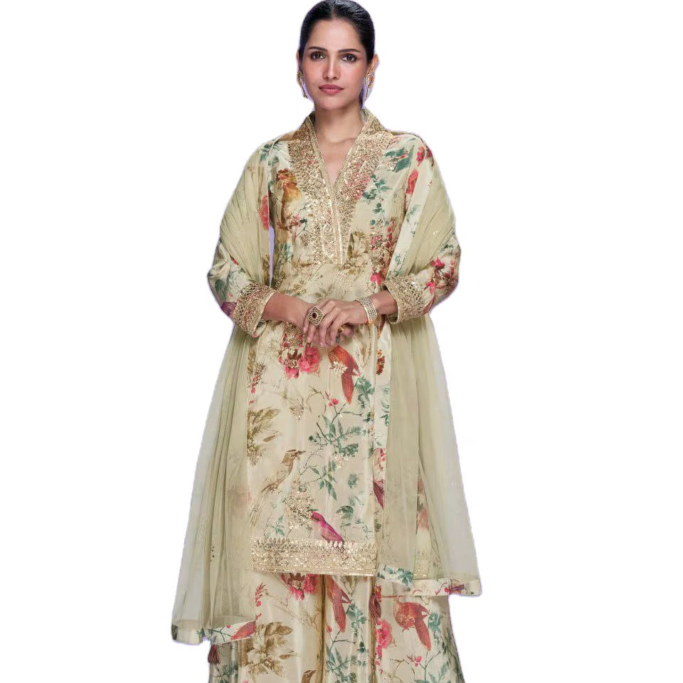 บริษัทชรีอินเดียนเอ็กซ์พอร์ตนำเสนอชุดสาหรี่กะมีซผ้าลินินพิมพ์ลายดอกไม้สวยงามประณีต พร้อมผ้าคลุมไหล่ ดีไซน์พิเศษสำหรับงานปาร์ตี้