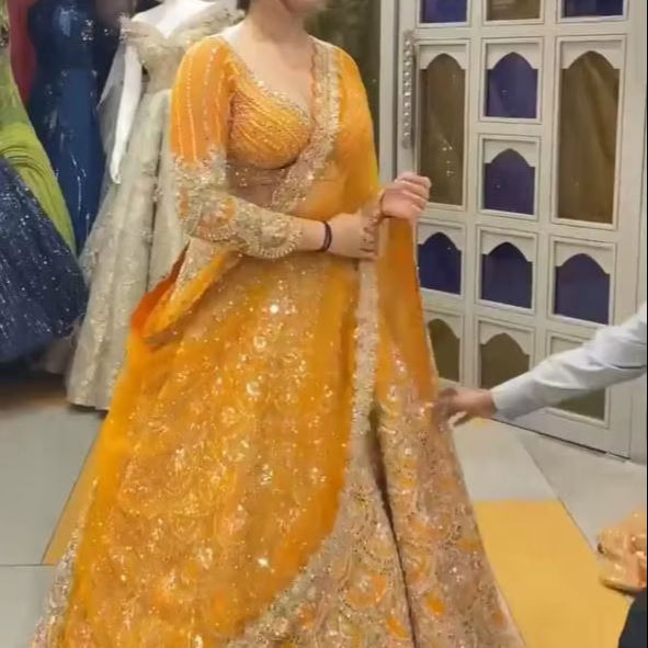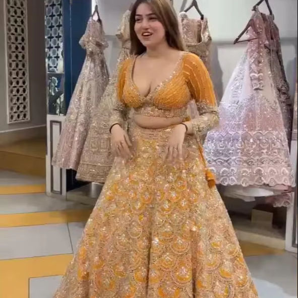 บริษัท ชรี อินเดียน เอ็กซ์พอร์ต จำหน่ายชุดเลเฮนกา โจลี ปักลายสีเหลืองพิเศษสำหรับงานแต่งงาน ไซส์พลัส ราคาขายส่ง