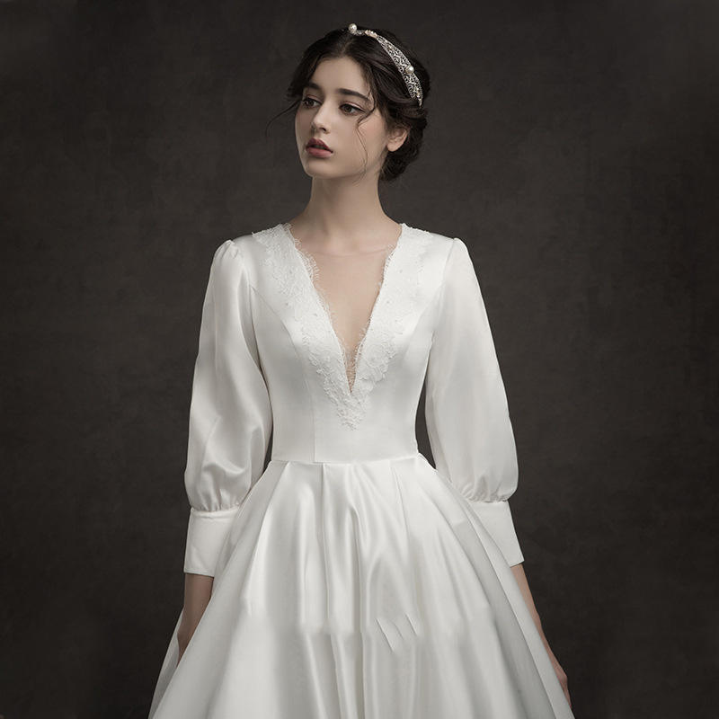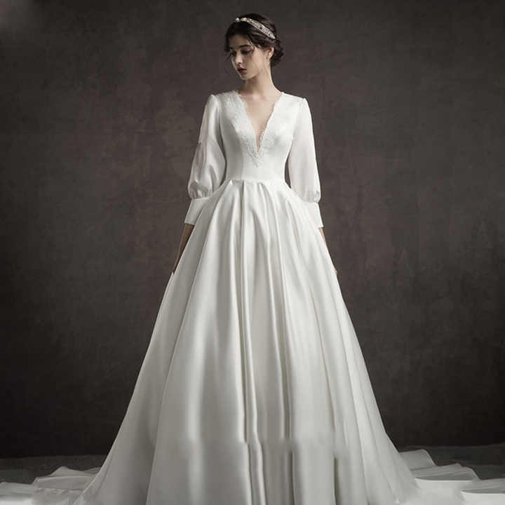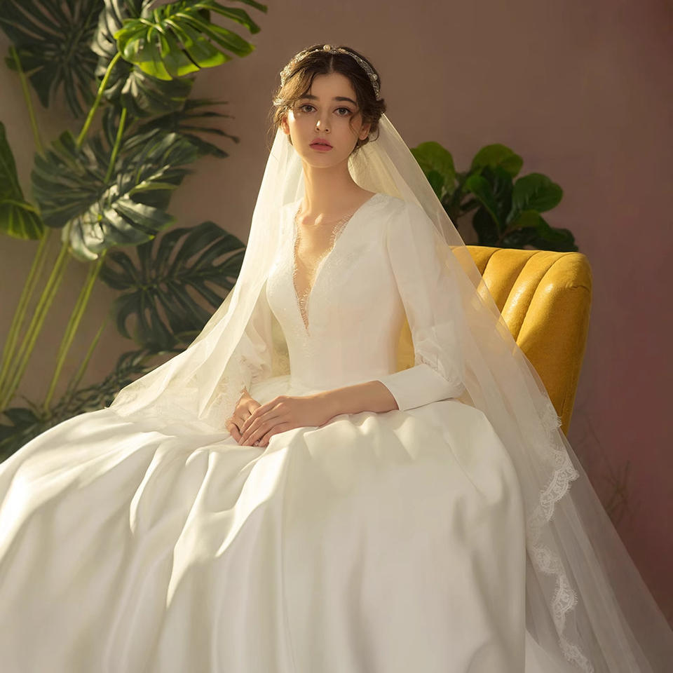 ชุดแต่งงานทรงวีบอลยาวแบบเบา สไตล์ฝรั่งเศสย้อนยุค แขนยาว คอวี พร้อมชายกระโปรงยาว สำหรับงานแต่งงานฤดูหนาวปี 2025