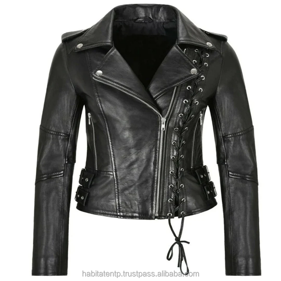 Side Lace Pure Black Genuine Leather Women Jackets Biker Racer Style Affordable Store First Layer Full Grain Leather Jacket