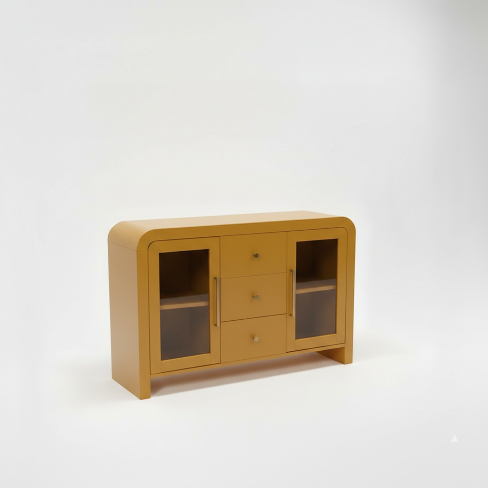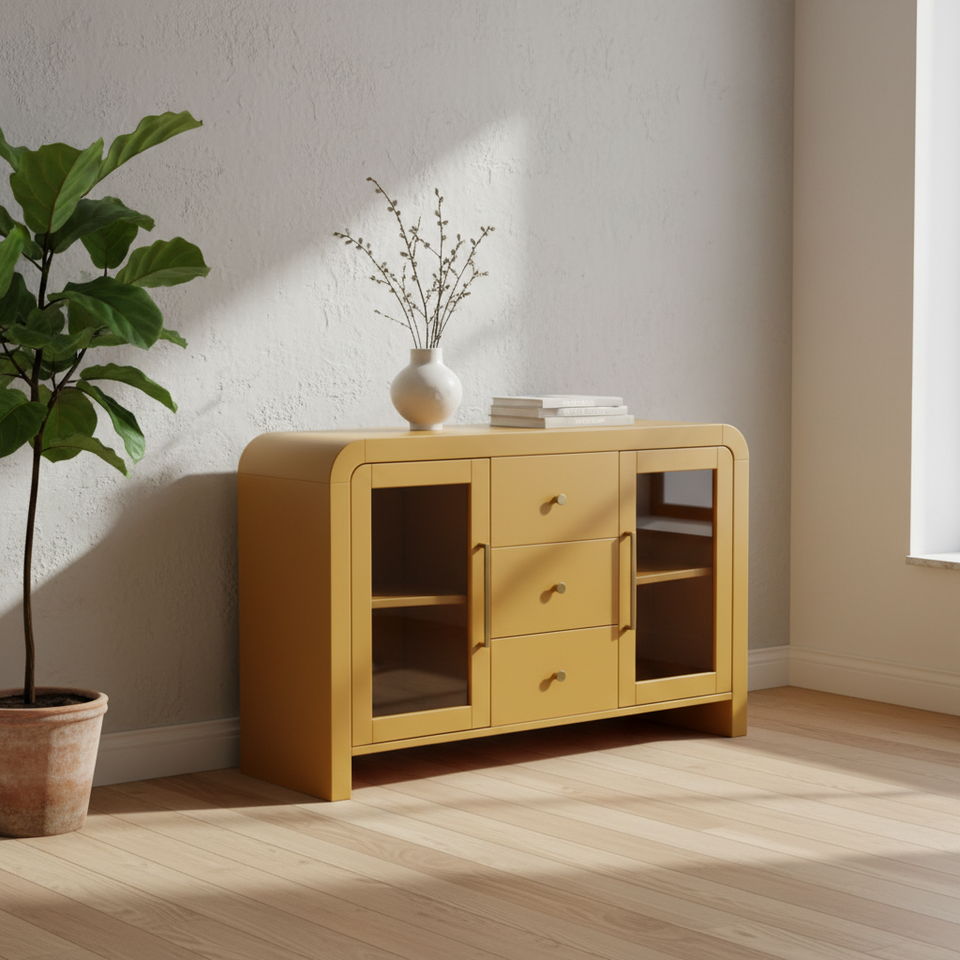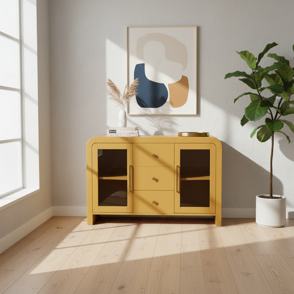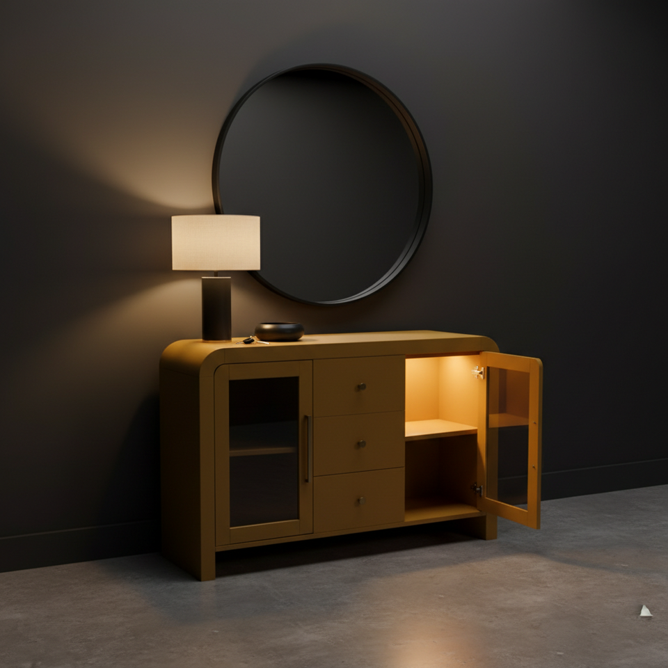 ตู้ไซด์บอร์ด ตู้บุฟเฟ่ต์ห้องนั่งเล่น ตู้คอนโซลพร้อมลิ้นชักกลางสามช่องและกระจกด้านข้างสองด้าน ดีไซน์ทันสมัย สีสันโดดเด่น