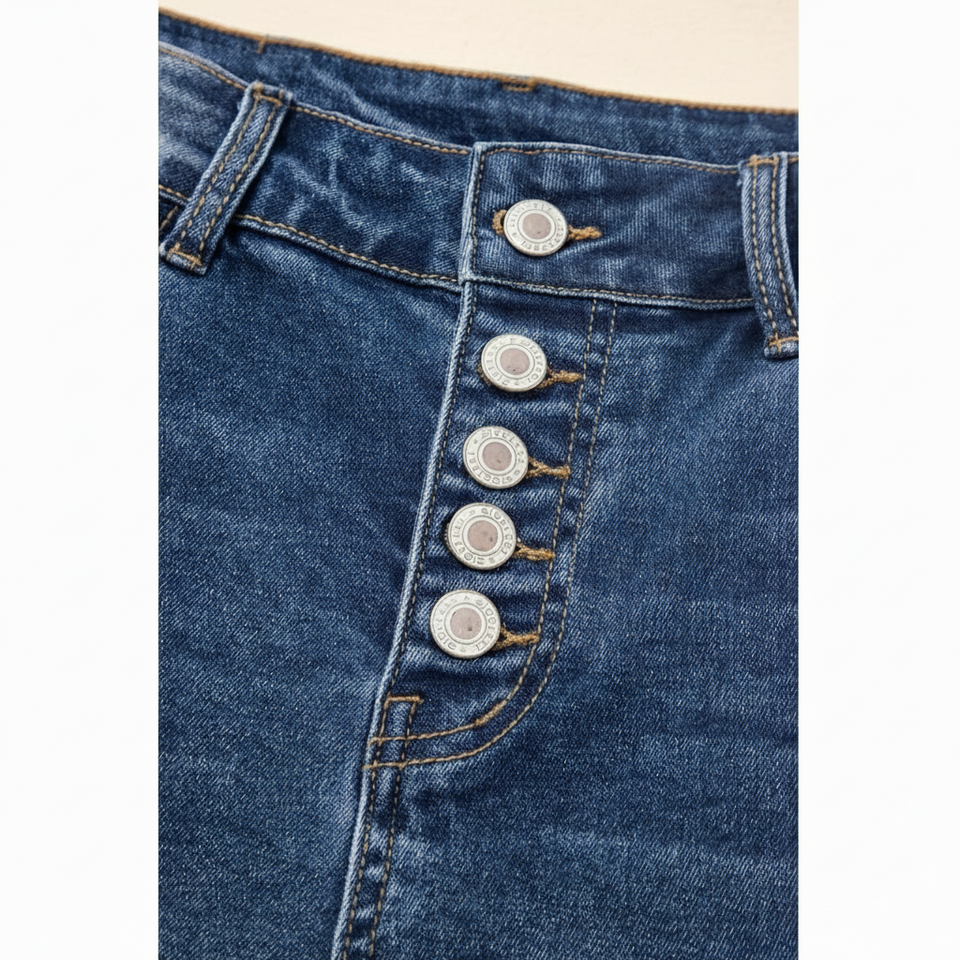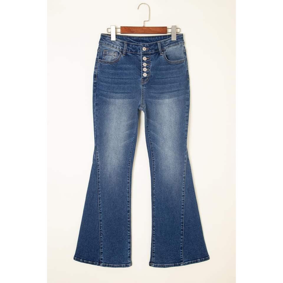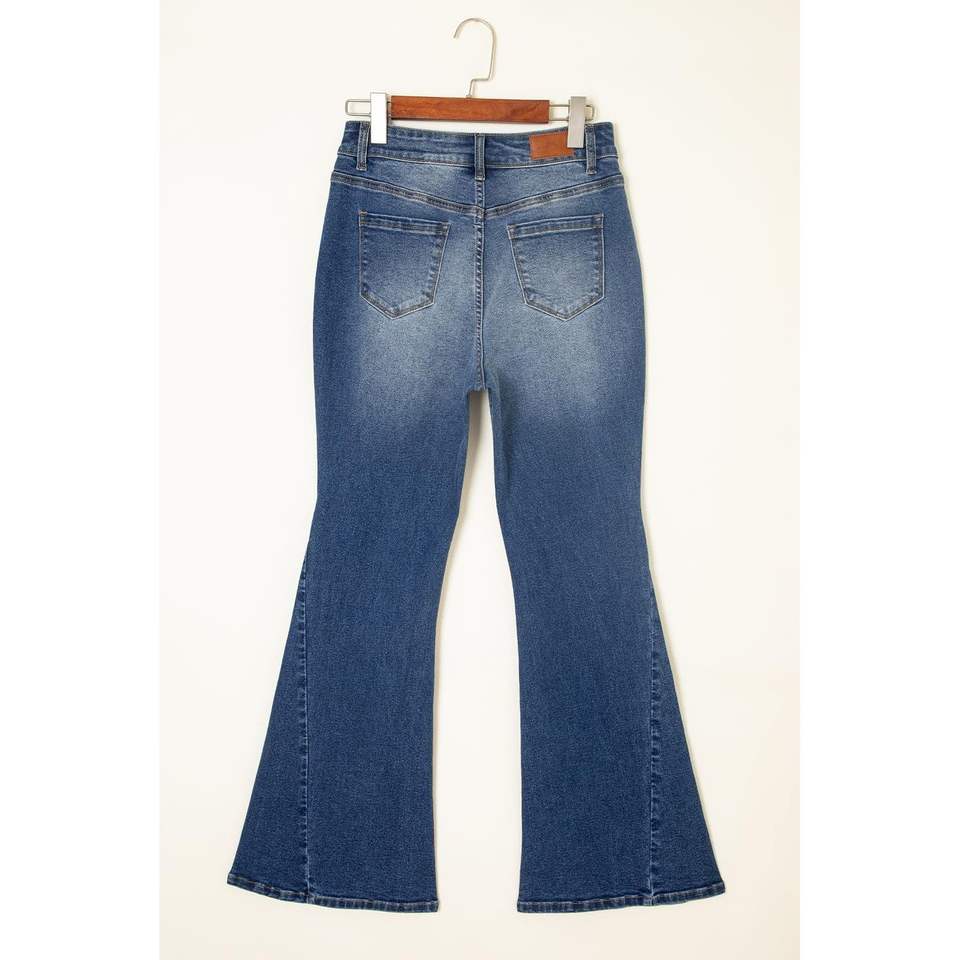 Sidefeel กางเกงยีนส์เอวสูงสำหรับสตรีท, กางเกงยีนส์เอวสูงยืดทรงกระดิ่งขากว้าง