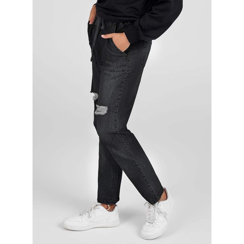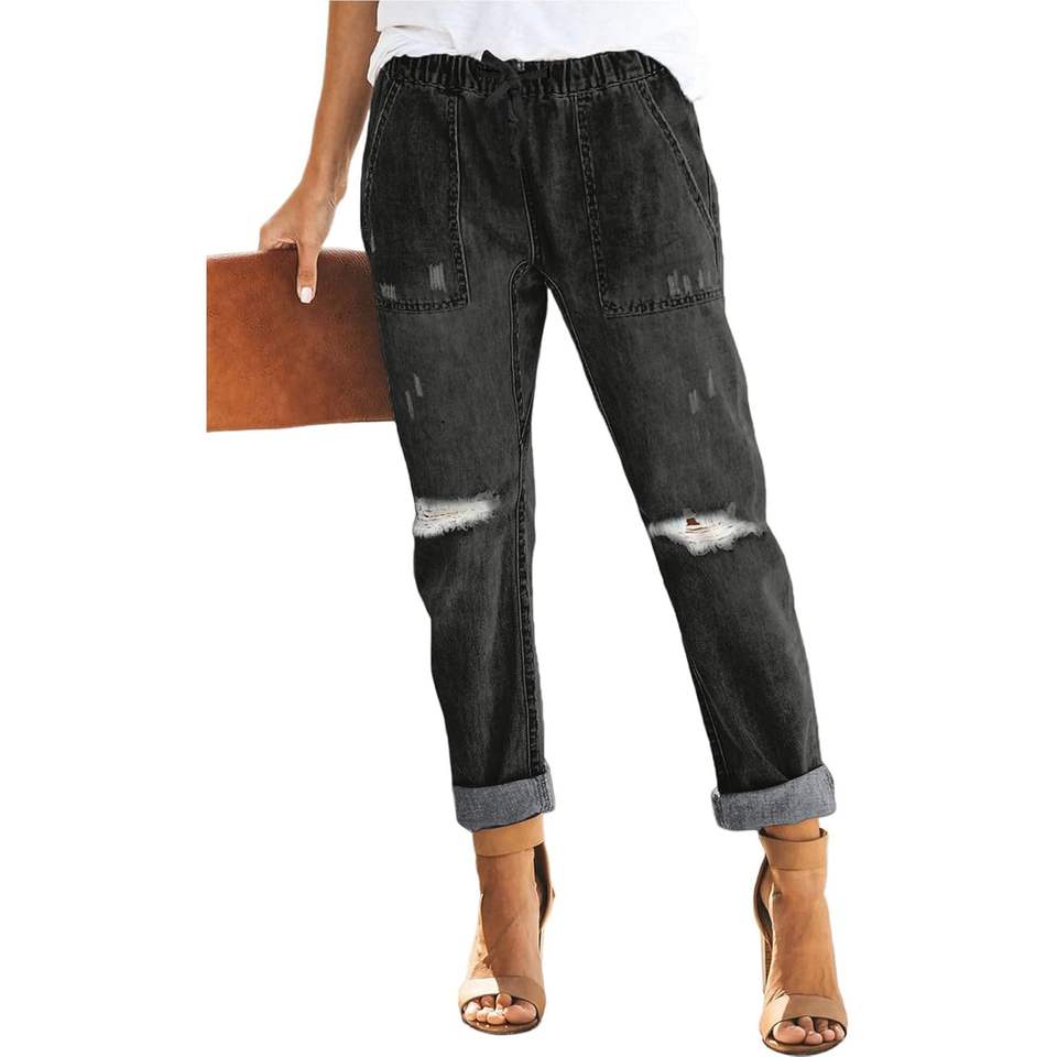 Sidefeel Women's High Waist Distressed Pockets Denim Joggers Breathable Elastic Drawstring Waist Jeans Pants Black Size XL 16