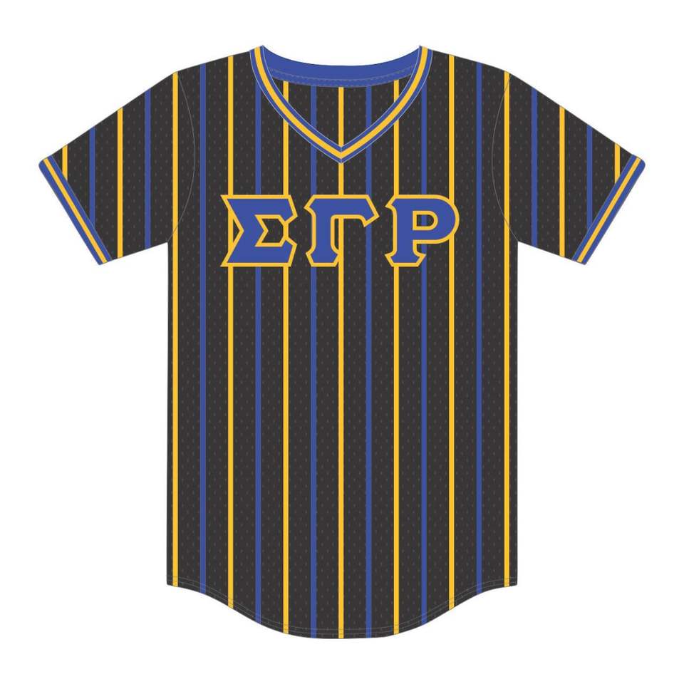 Sigma Gamma Rho Black Pinstripe Pullover Baseball Jersey 100% Polyester Mesh SGRho Sorority V Neck T Shirt with Applique Logos