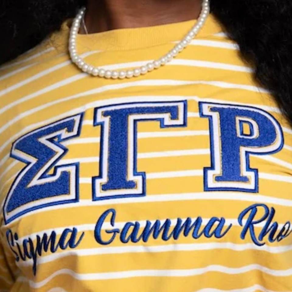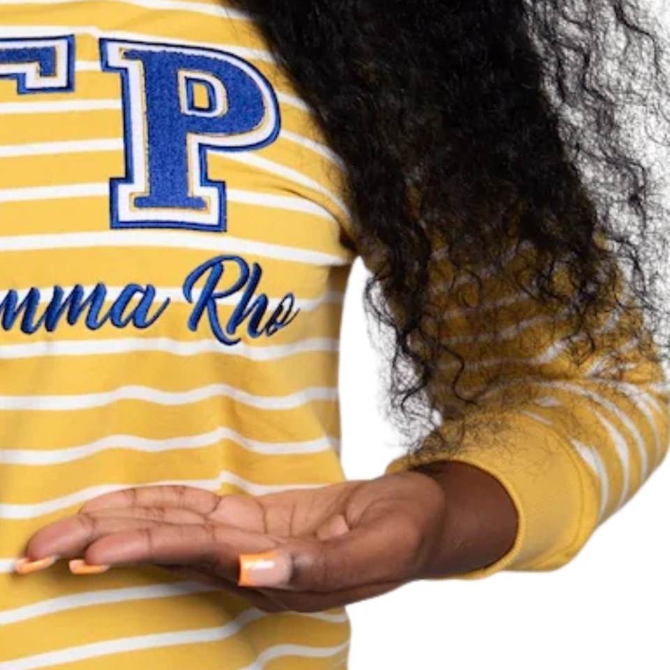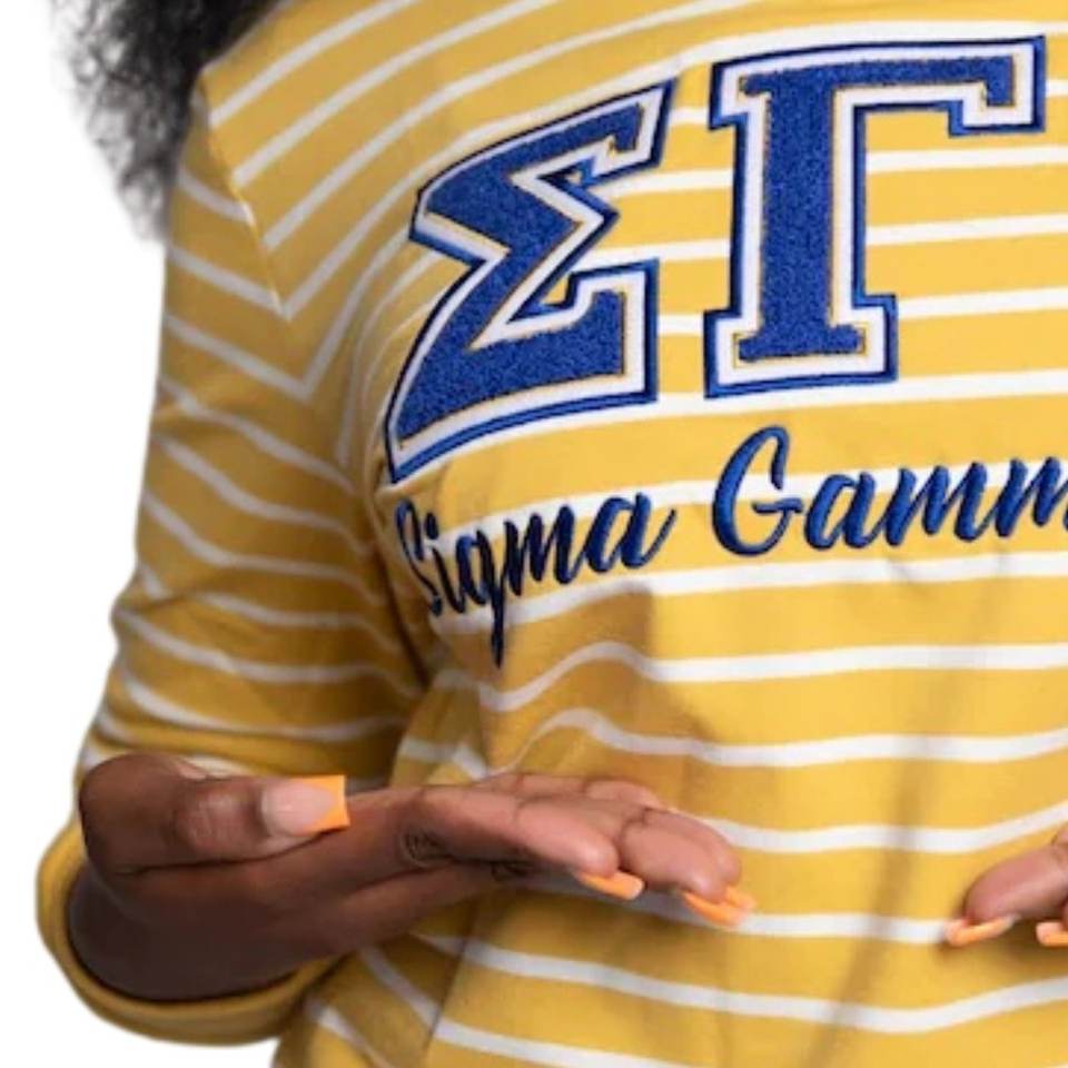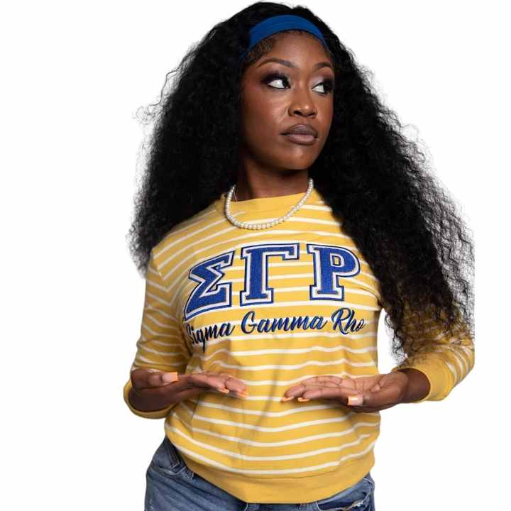 ซิกมาแกมมาโรเสื้อสเวตเตอร์ลายทางสีขาวทองผู้หญิงกรีกซอร์โรริตี้คอกลมสไตล์สตรีทแวร์ลำลอง