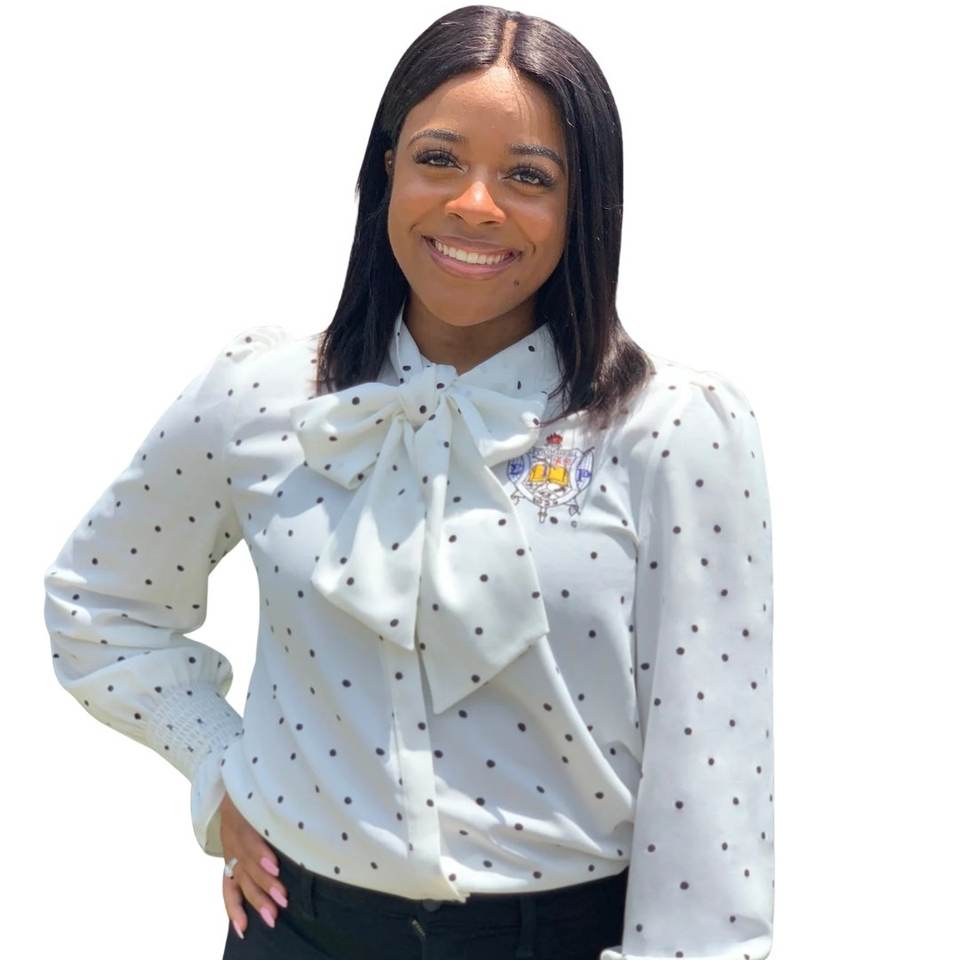 ซิกมาแกมมาโรเสื้อเชิ้ตลายจุดผู้หญิงเสื้อสีขาวกรีกสหพันธ์นักศึกษาแขนยาวติดกระดุมสไตล์ลำลองหรูหรา