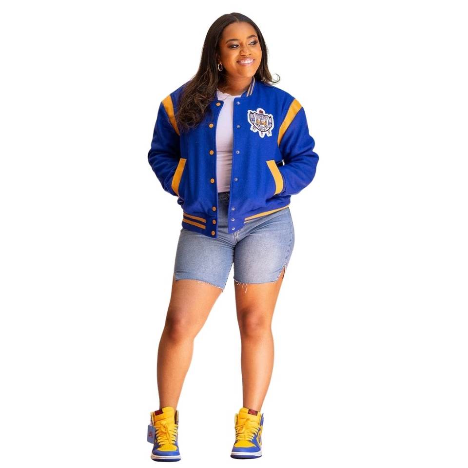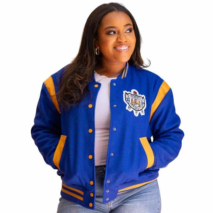 เสื้อแจ็คเก็ตวูลสไตล์วาร์ซิตี้ย้อนยุค Sigma Gamma Rho สำหรับผู้หญิง สีน้ำเงิน-ทอง ติดกระดุมแบบ Snap ทรงบอมเบอร์ สไตล์ลำลองแนวสตรีทแวร์สำหรับชมรมนักศึกษากรีก
