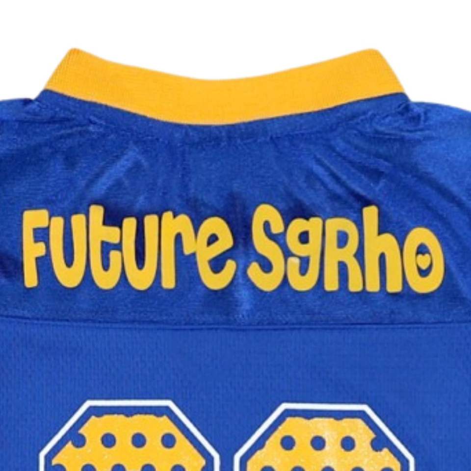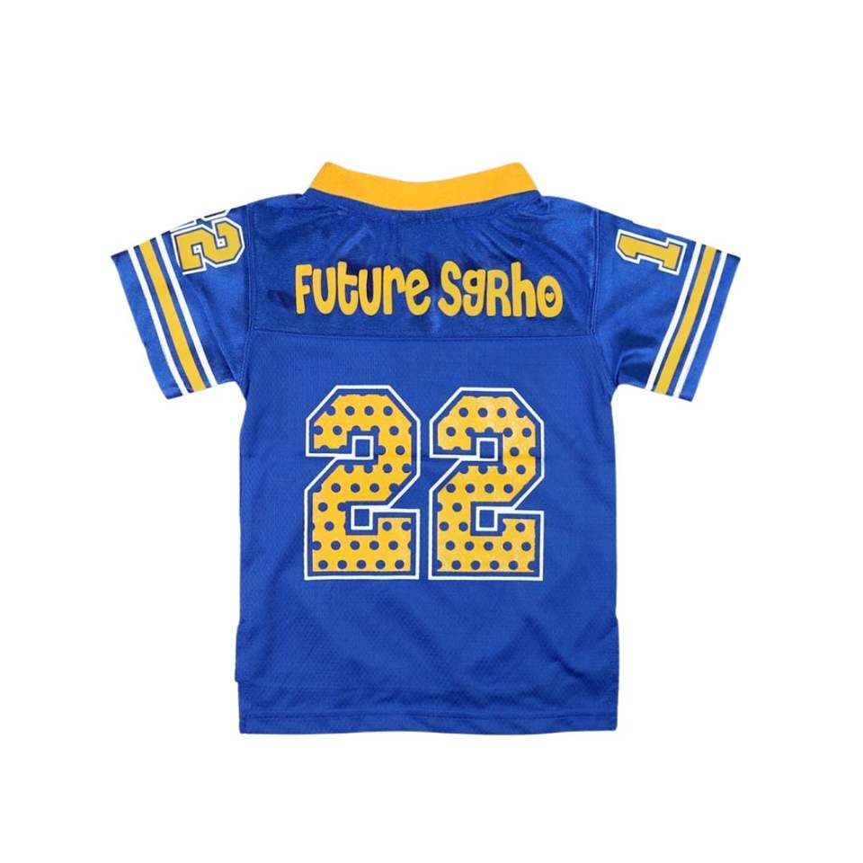 Sigma แกมมา Rho sgrho เสื้อฟุตบอลเด็กสีฟ้าทองผ้าโพลีเอสเตอร์100% ทีมมีโลโก้ด้านหน้าปักไหล่หลัง