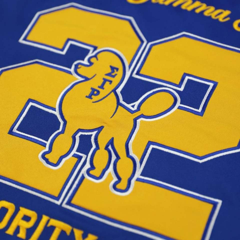 Sigma แกมมา Rho sgrho เสื้อฟุตบอลสีฟ้าทองแบบชมรมกรีกผ้าโพลีเอสเตอร์100% ปักโลโก้ทีมด้านหน้าด้านหลังไหล่