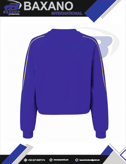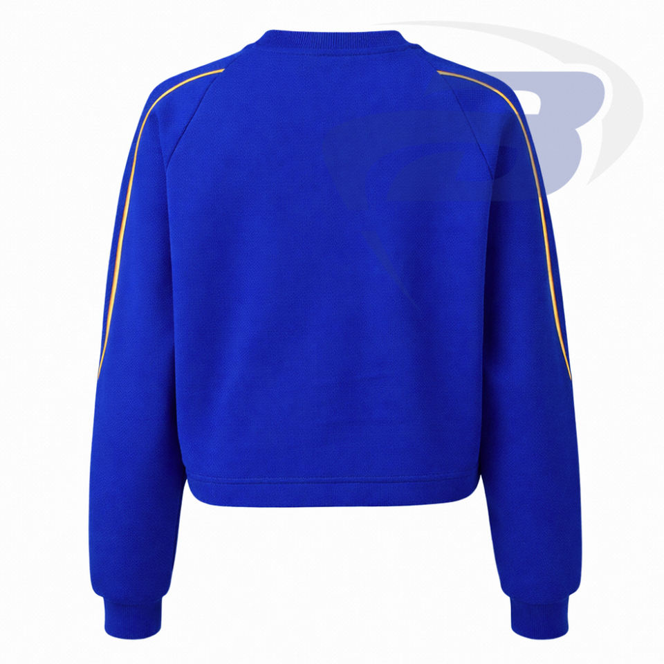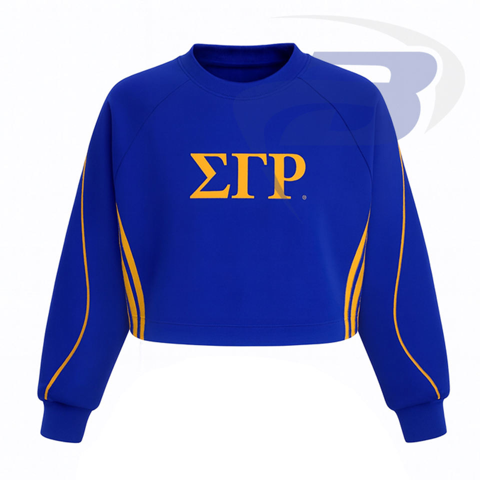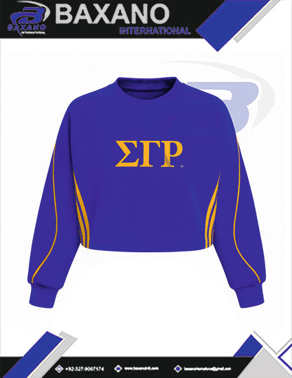เสื้อครอปสีน้ำเงินและสีทองของชมรมซิกมาแกมมาโร พร้อมลายปักสีทองและดีไซน์ลายพิมพ์ สำหรับชมรม SGR ชุดนักศึกษา
