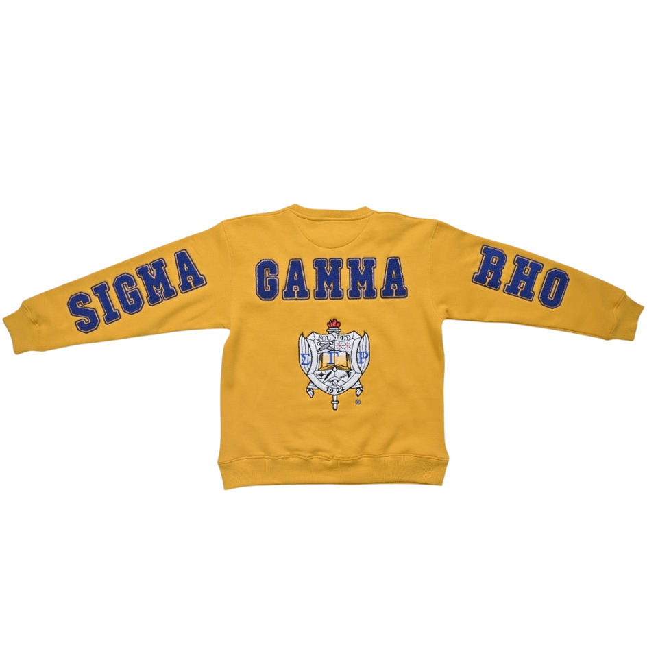เสื้อสเวตเชิ้ตเชนิลล์สีทอง Sigma Gamma Rho Sorority สำหรับผู้หญิง พร้อมตัวอักษรกรีก ผ้าฟลีซพรีเมียม คอกลม สำหรับสุภาพสตรี เสื้อผ้าสไตล์กรีก