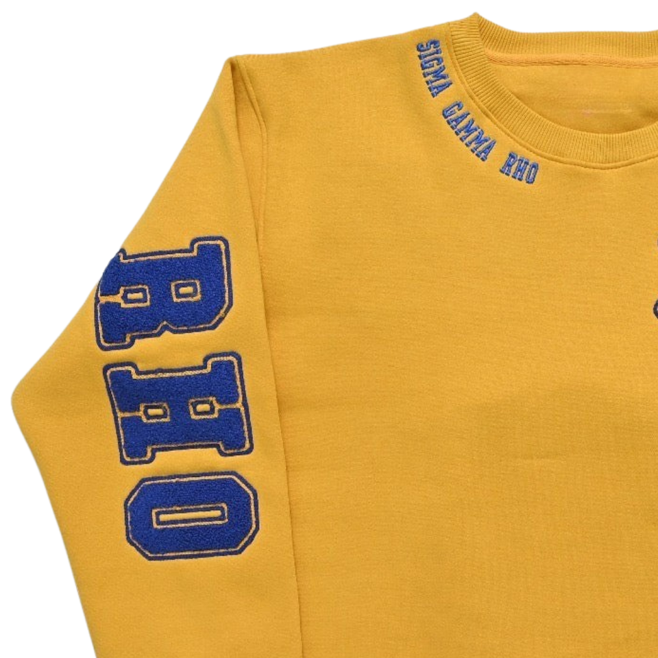 เสื้อสเวตเชิ้ตไหมพรมสีทอง Sigma Gamma Rho Sorority รุ่น Winter Chenille สำหรับผู้หญิง พร้อมตัวอักษรภาษากรีก ผ้าฟลีซพรีเมียม คอกลม มีตราสัญลักษณ์ด้านหน้า