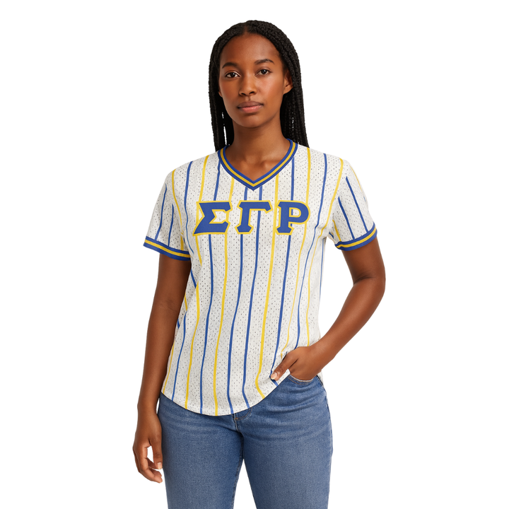 Sigma Gamma Rho White Pinstripe Pullover Baseball Jersey 100% Polyester Mesh SGRho Sorority V Neck T Shirt with Applique Logos