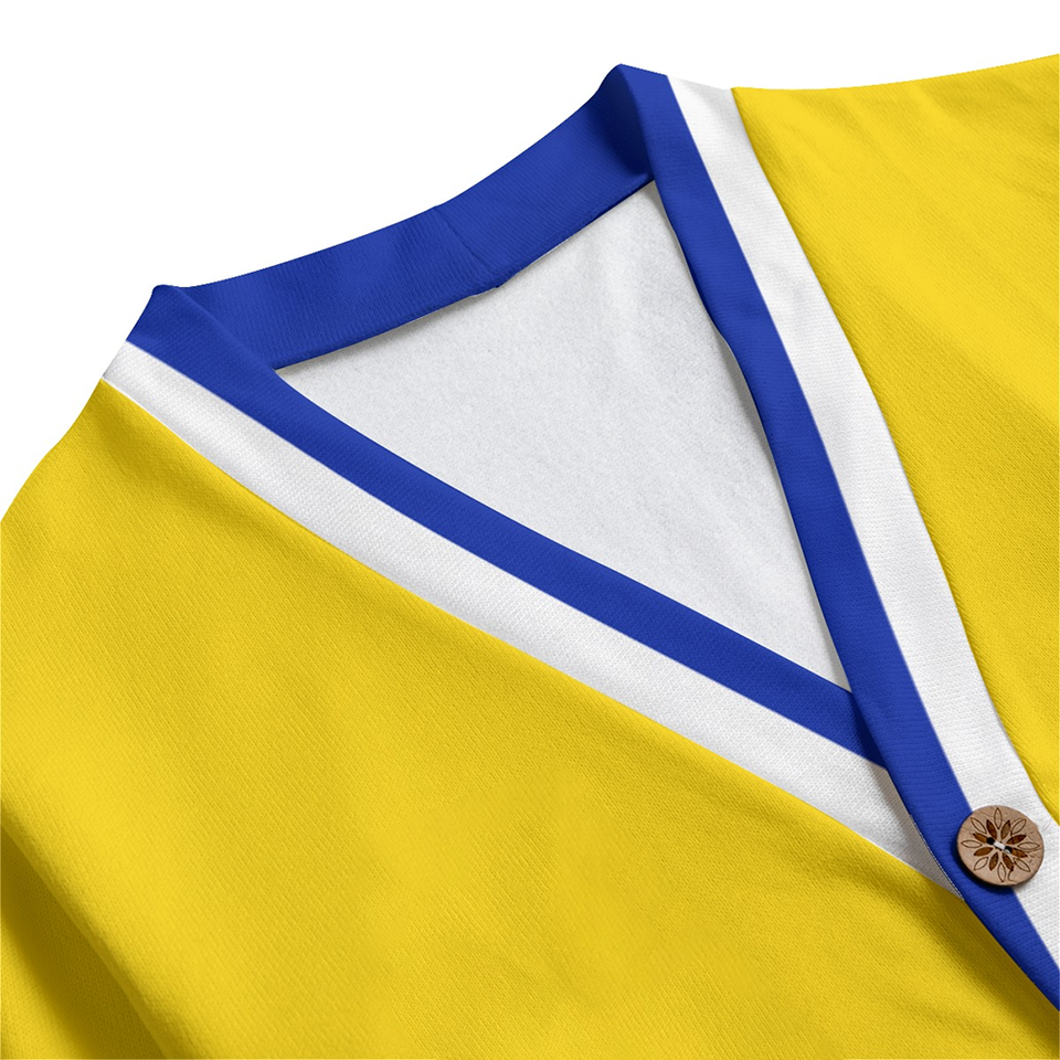 เสื้อคาร์ดิแกนไหมพรมหนานุ่มสีเหลือง น้ำเงิน ขาว ยี่ห้อ Sigma Gamma Rho รุ่น Winter ติดกระดุมไม้และกระเป๋าปะ | เสื้อถักขนแกะสไตล์กรีก