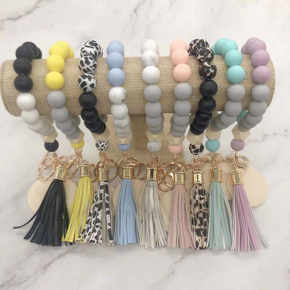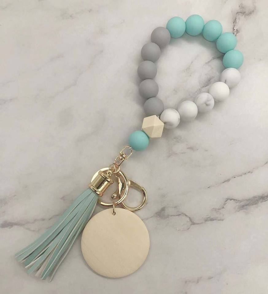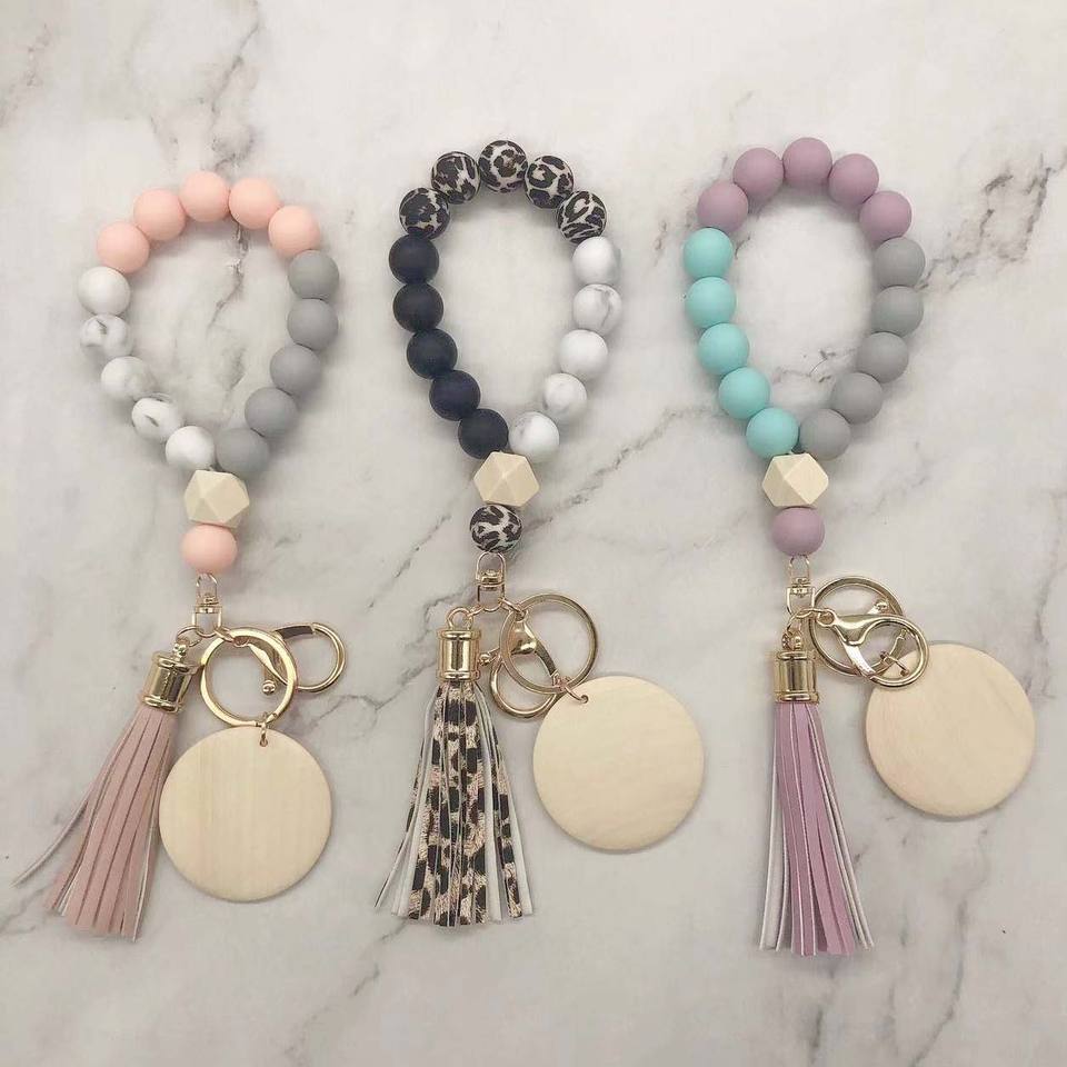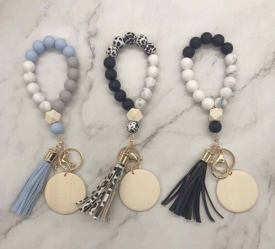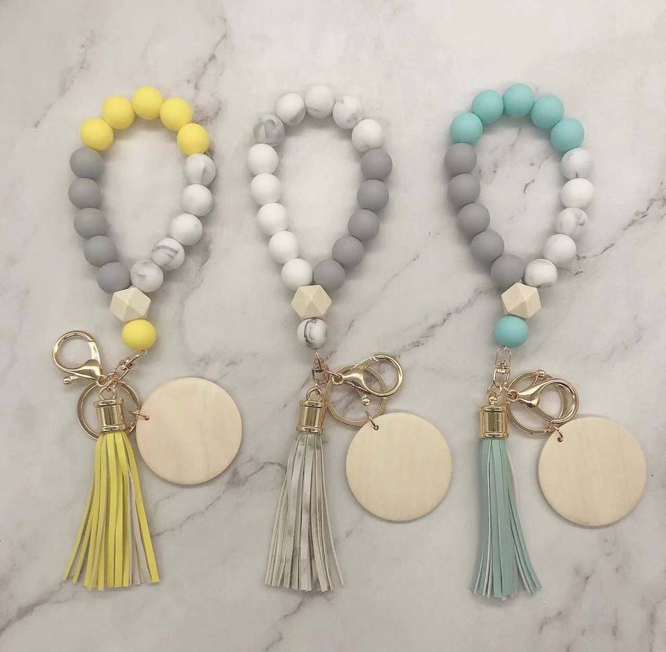 พวงกุญแจห้อยพู่ทำจากไม้เปล่าลายโมโนแกรมลูกปัดซิลิกอน