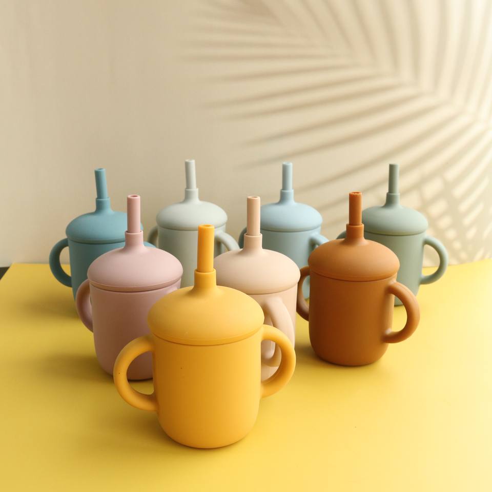 ถ้วยซิลิโคนสำหรับเด็กที่มีฝาปิดและซิลิโคนหลอดดูดถ้วยซิลิโคนสำหรับเด็ก