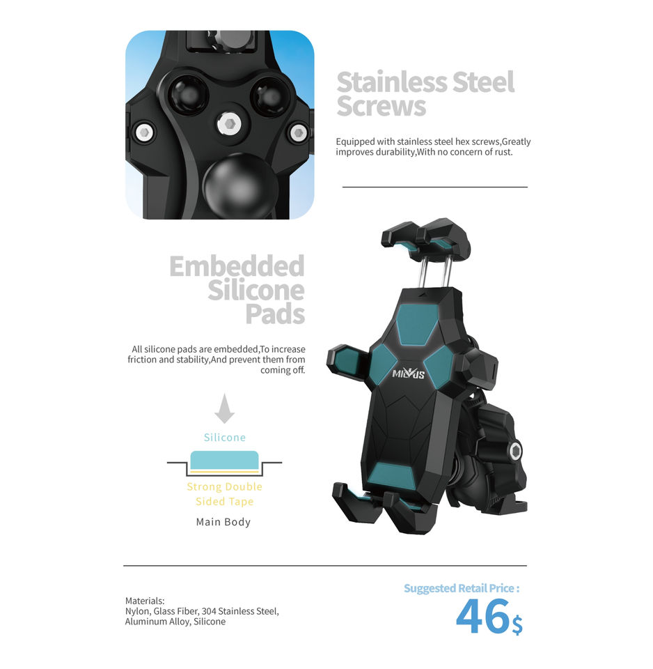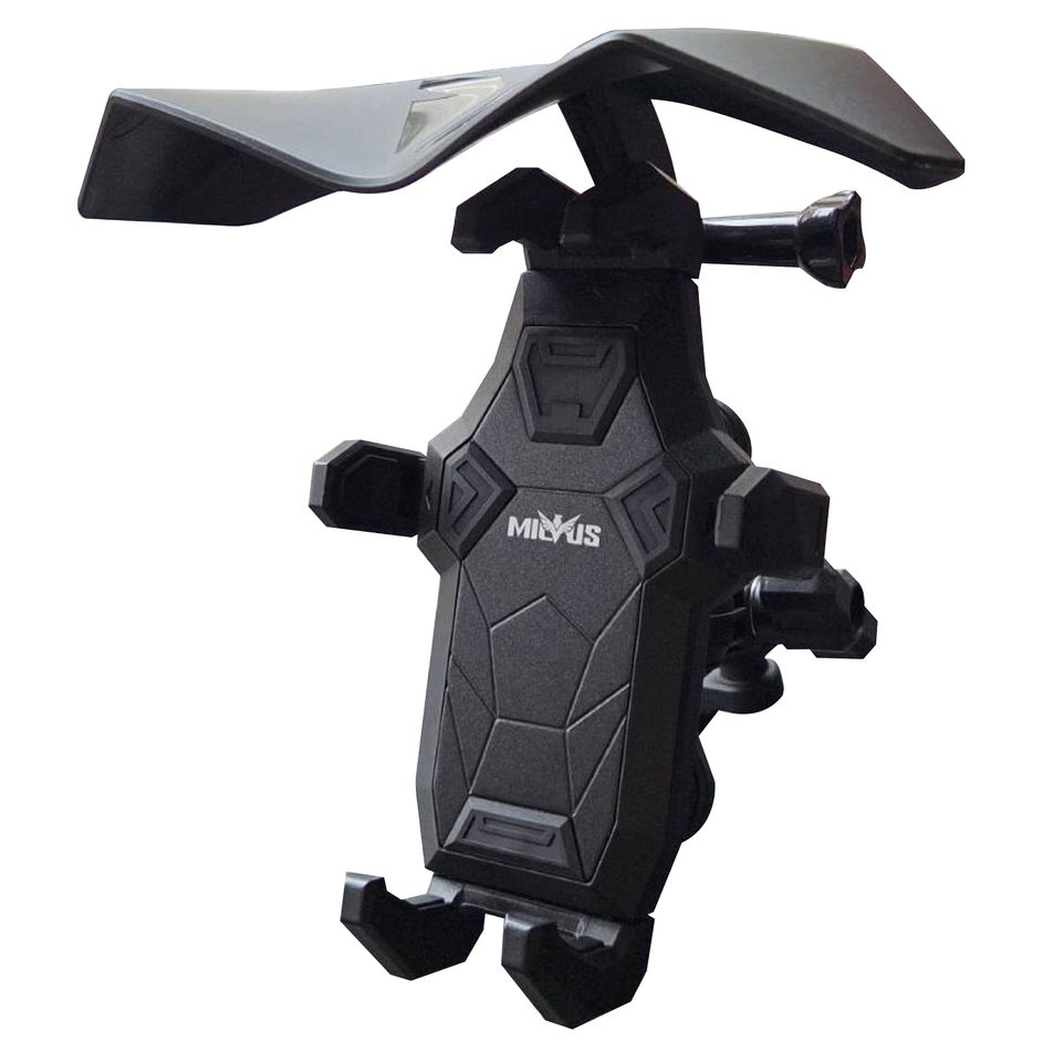 ขายึดโทรศัพท์มือถือสำหรับผู้ขับขี่มอเตอร์ไซค์ ทำจากไนลอนเสริมใยแก้วและสแตนเลส 304 พร้อมที่บังแดด ติดตั้งบนแฮนด์จับ เพื่อความปลอดภัย