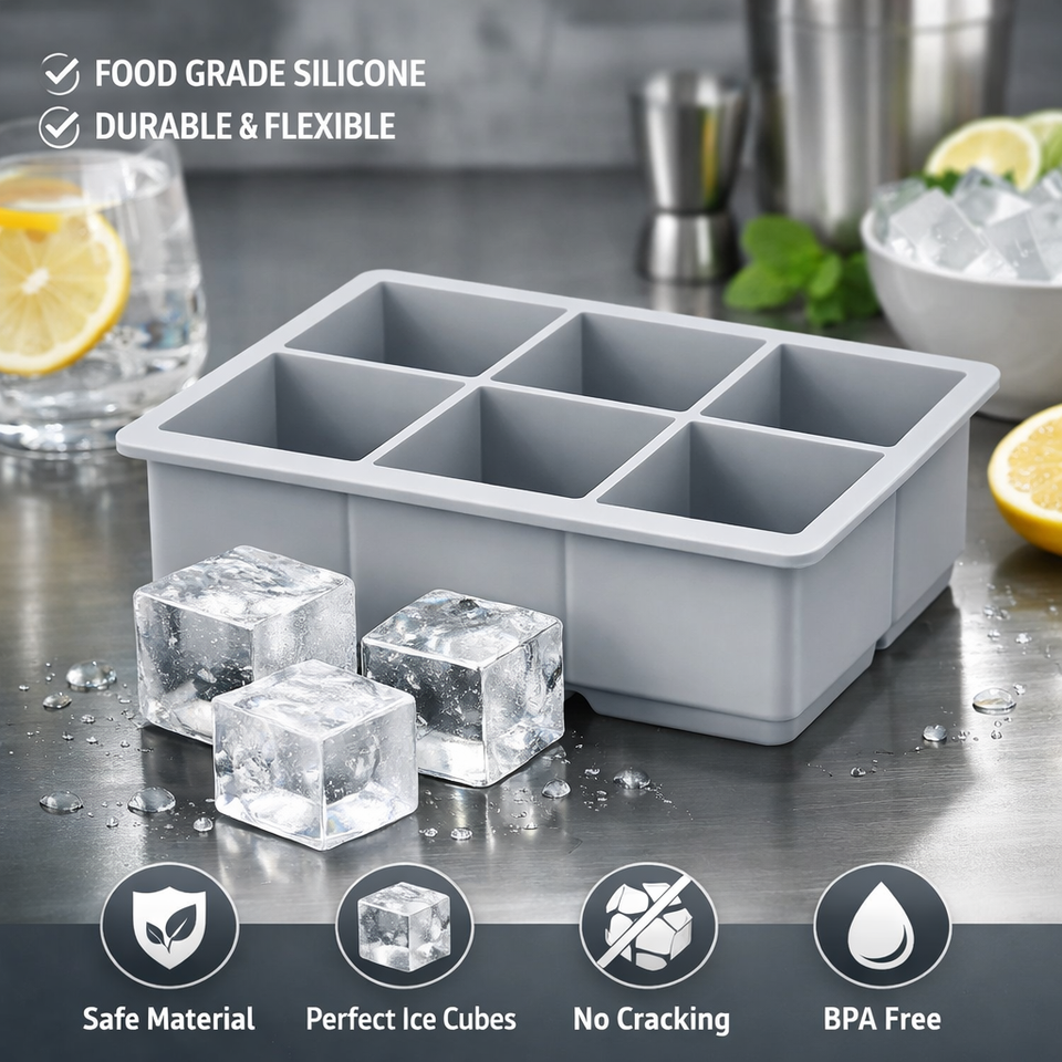 ถาดทำน้ำแข็งซิลิโคน 6 ช่อง ปลอดสาร BPA เกรดอาหาร ทนทาน ยืดหยุ่น