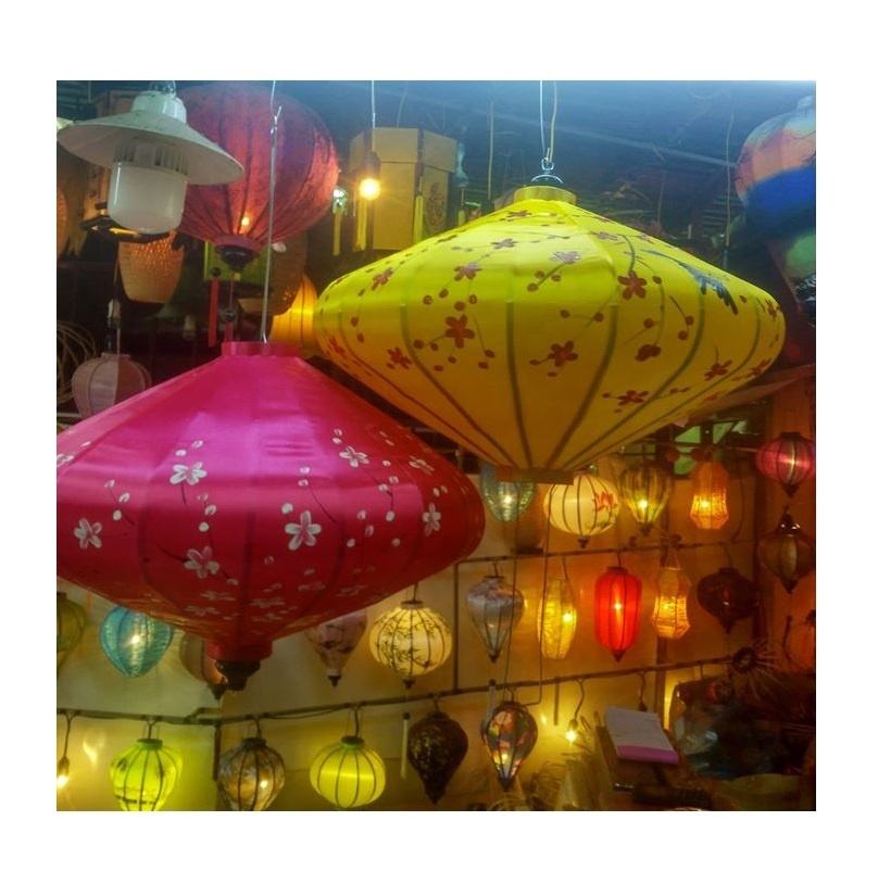 โคมไฟผ้าไหมผิวมันเงาพร้อมโครงสร้างหวายสำหรับตกแต่งภายในจากเวียดนามในสไตล์เอเชียแบบดั้งเดิมที่โฮอิอัน