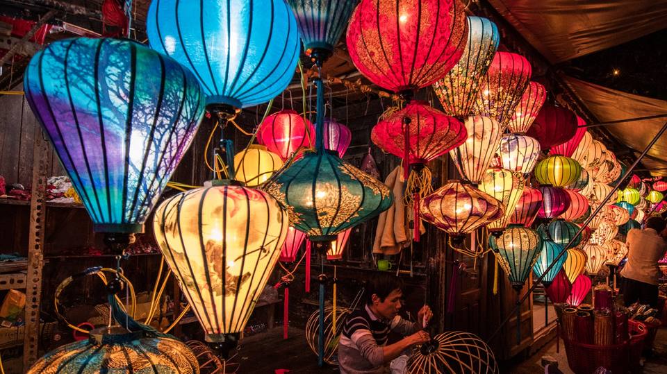 โคมไฟผ้าไหมที่สร้างขึ้นจากผ้าไหมที่มีสีสันและโครงลวดเหล็กที่น่าสนใจสำหรับการจัดแสดงงานปาร์ตี้หรือโอกาสพิเศษในเวียดนาม