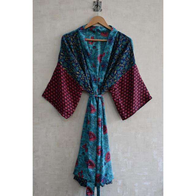 Silk Patchwork Kimono Robe Women Long Boho Nightwear Gown, Lightweight Lounge Robe