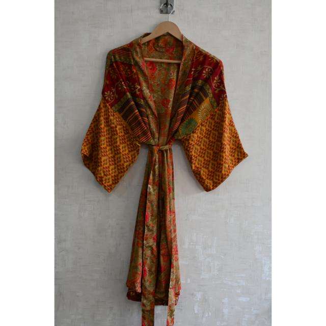 ชุดกิโมโนผ้าไหมปะติดปะต่อสำหรับผู้หญิง ชุดนอนยาวสไตล์โบโฮ เสื้อคลุมเนื้อผ้านุ่มพลิ้วสบาย