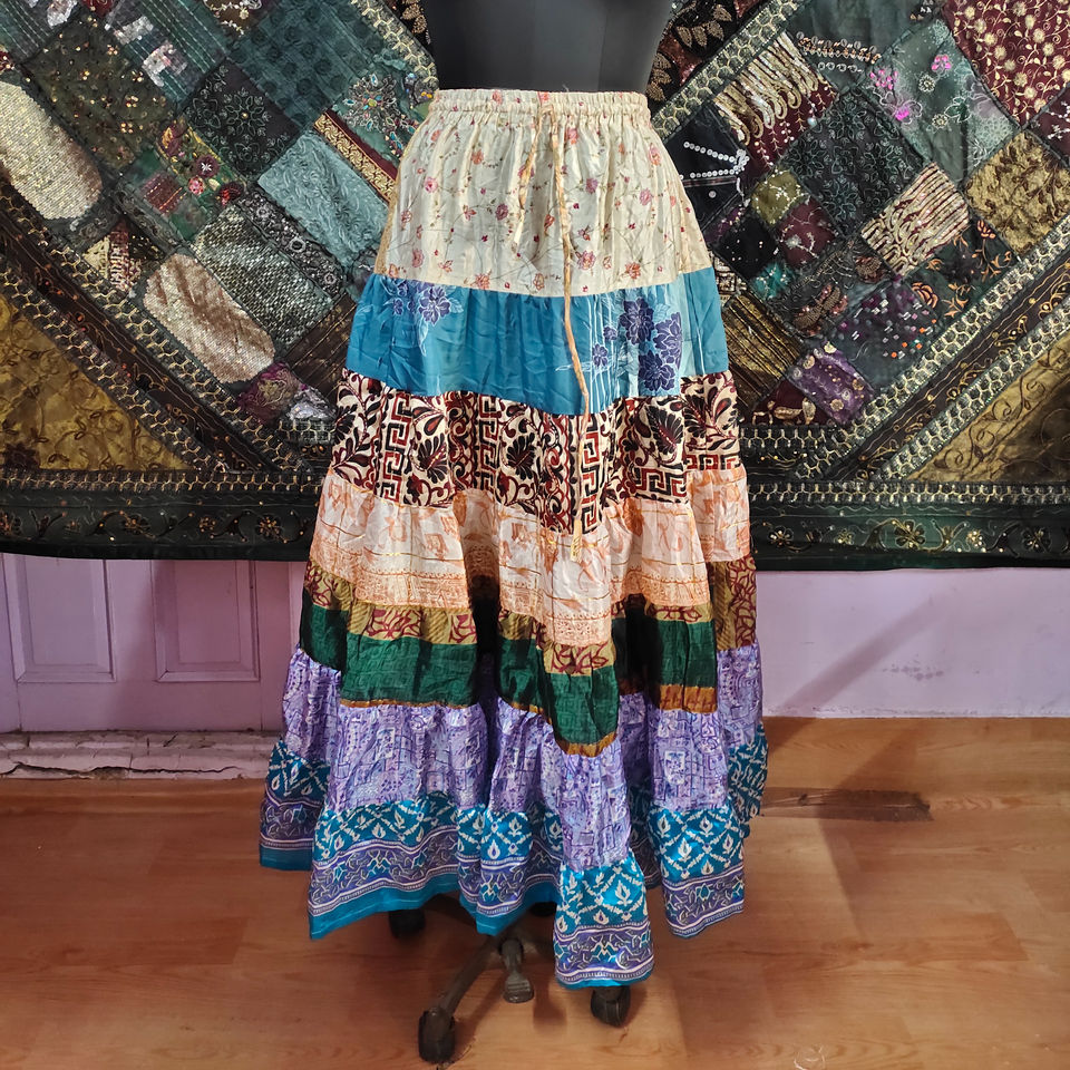 Silk Sari Handmade Indian Vintage Bohemian Printed Patchwork Women Layer Skirts