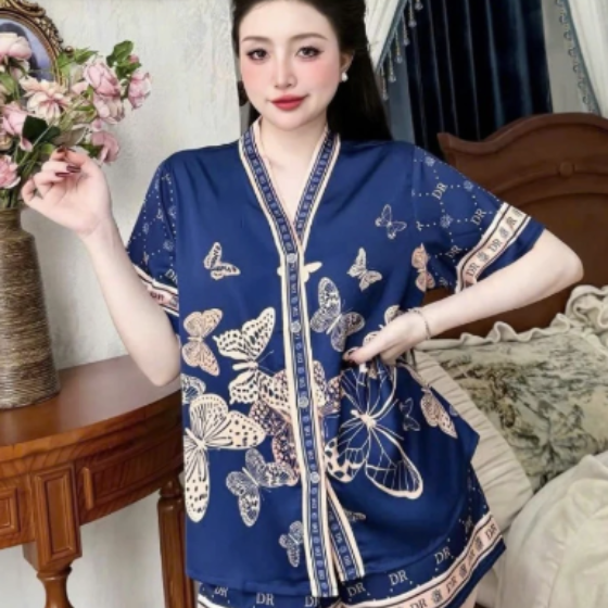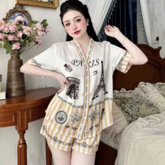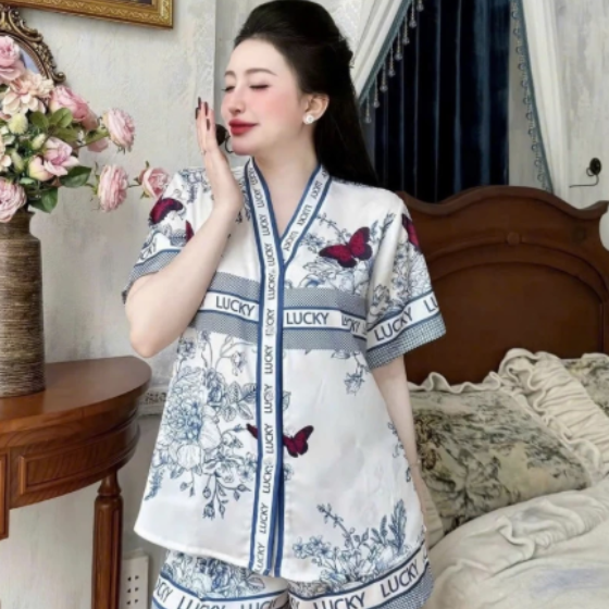 ชุดนอนผ้าซาติน100% ปกคอพับลายพิมพ์ระบายความร้อนสวมใส่สบายระบายอากาศได้ดี