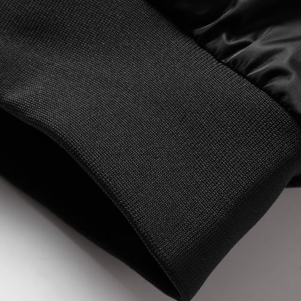แจ็คเก็ตบอมเบอร์แบบมีซิป แขนผ้าซาตินไหม ตกแต่งตัวอักษรตามสั่ง บุด้วยผ้าผสมเนื้อนุ่มพิเศษ บุซับในแบบควิลท์ให้ความอบอุ่น แจ็คเก็ตผู้ชาย
