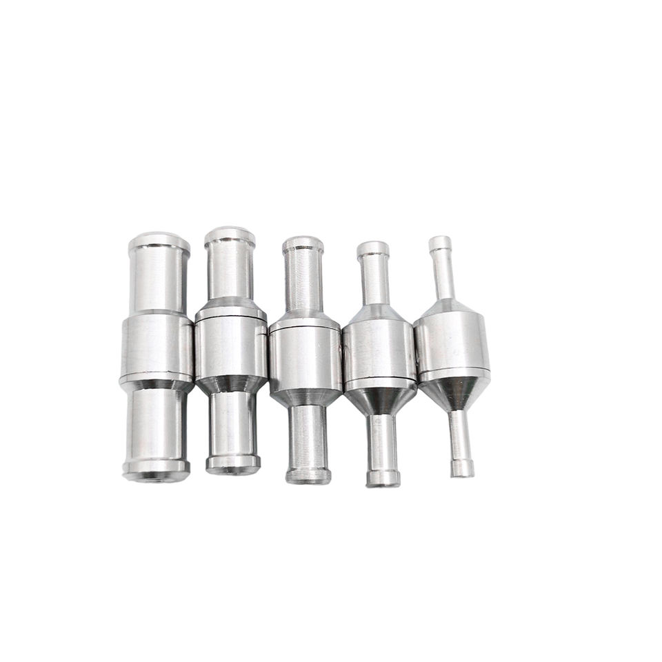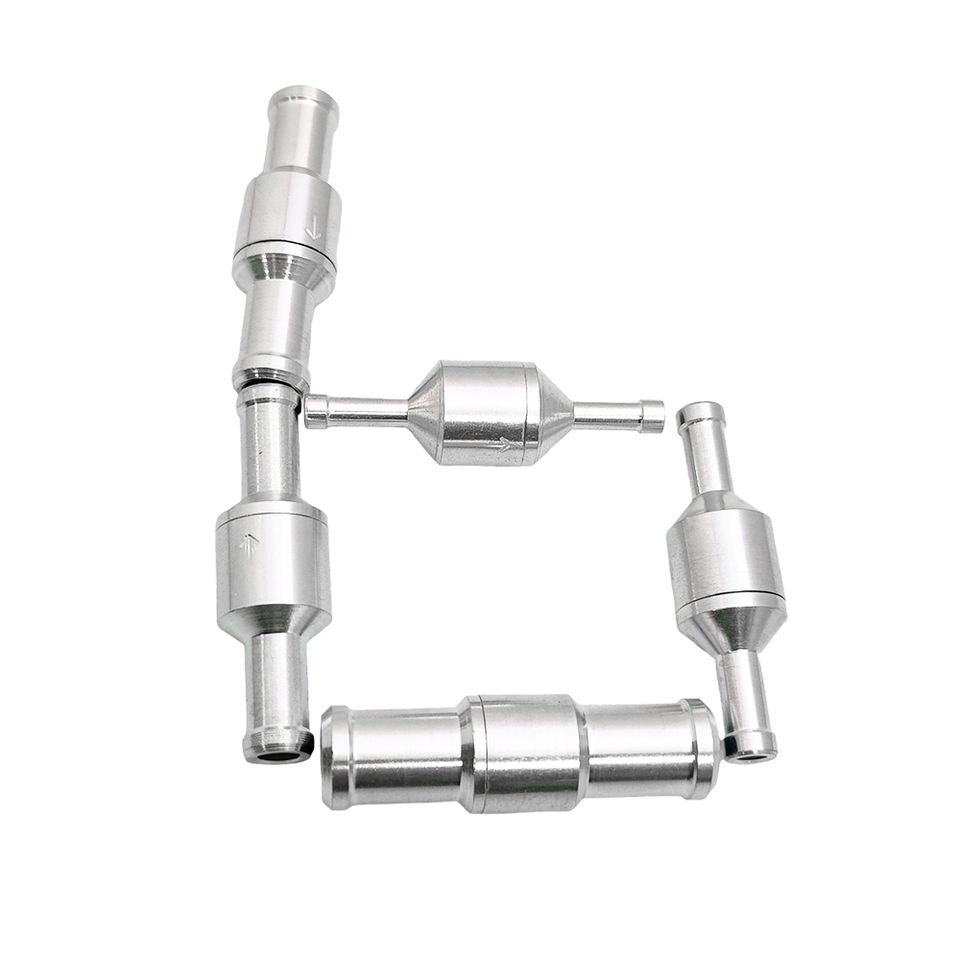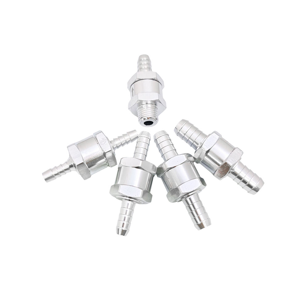 วาล์วกันกลับแบบทางเดียวอะลูมิเนียมสีเงิน อุปกรณ์เสริมอเนกประสงค์แบบแมนนวลสำหรับน้ำมันเชื้อเพลิงดีเซลเบนซินสำหรับยานยนต์ เฮลิคอปเตอร์