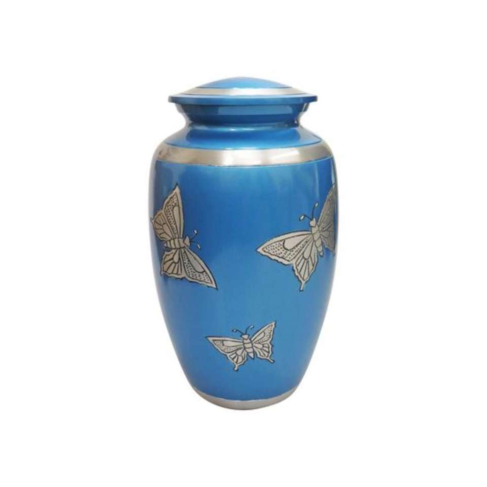 โกศโลหะรูปผีเสื้อแกะสลักรูปโกศสีเงินแบบโค้งงอสีฟ้าสำหรับงานศพ