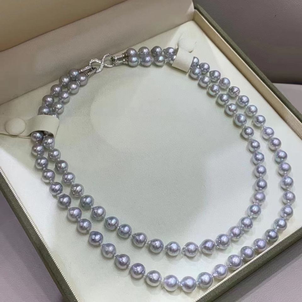สร้อยคอมุกธรรมชาติสองชั้น สีเงิน น้ำเงิน เทา ขนาด 9-8 มม. ทรงกลม มีตำหนิเล็กน้อย สีสวยงาม 100% จับคู่ได้ ฟรีการสลับเปลี่ยน