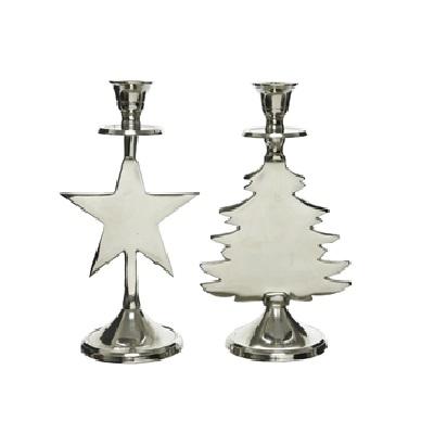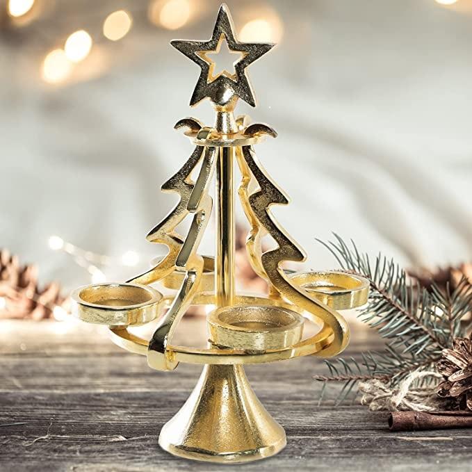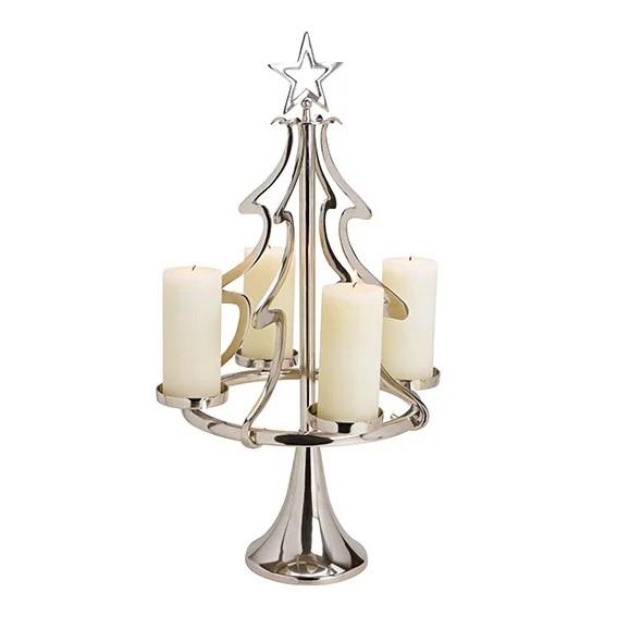 เชิงเทียนสีเงินประดับต้นคริสต์มาสพร้อมดาวสำหรับเทียนสี่ชิ้นทำจากอลูมิเนียมที่สง่างามกลางโต๊ะสำหรับไฟตกแต่งวันหยุด