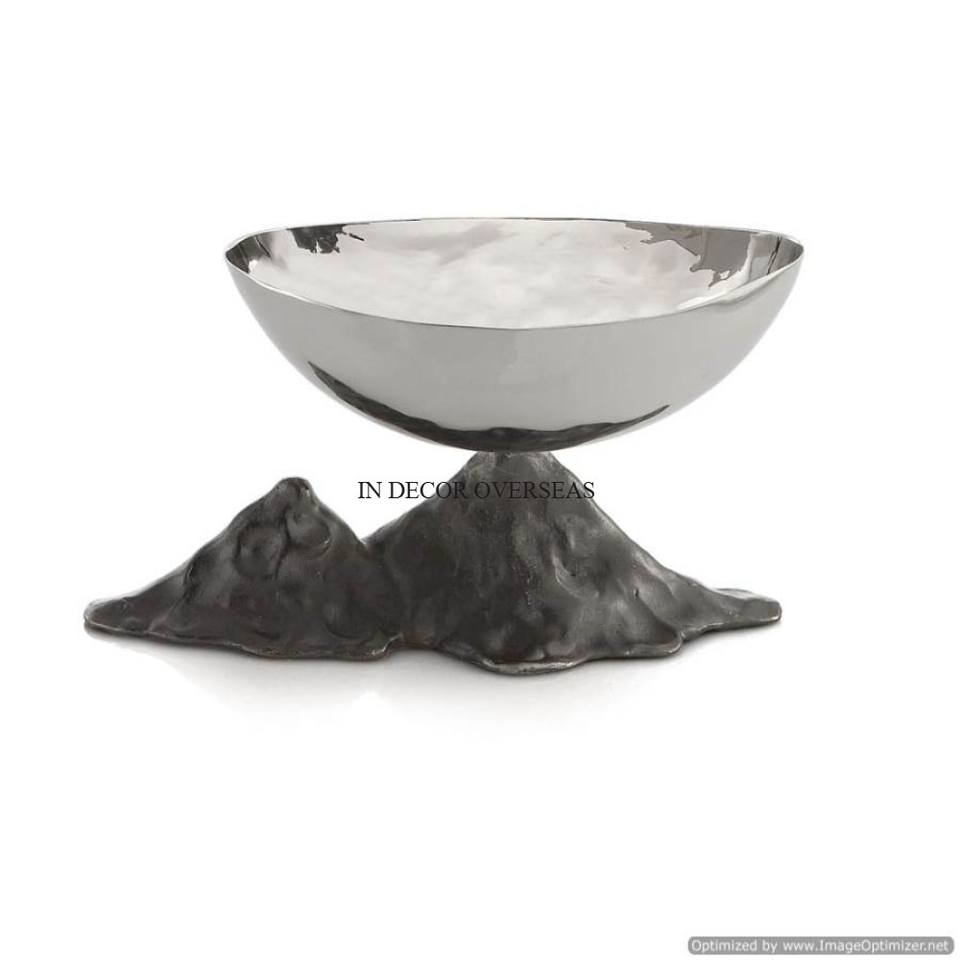ชามโลหะทรงกลมขัดเงาเคลือบเงาสีเงินพร้อมฐานตั้งของนักออกแบบโบราณเคลือบผงสีดำ