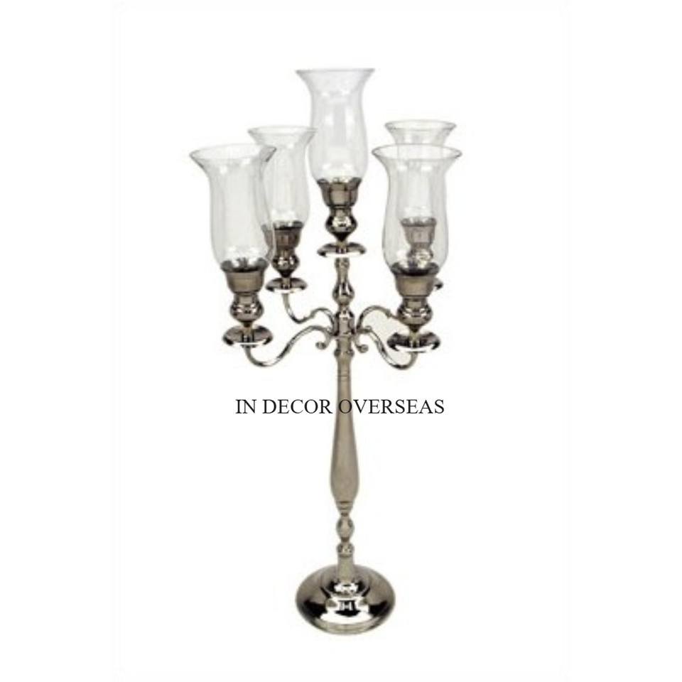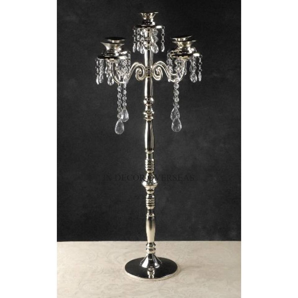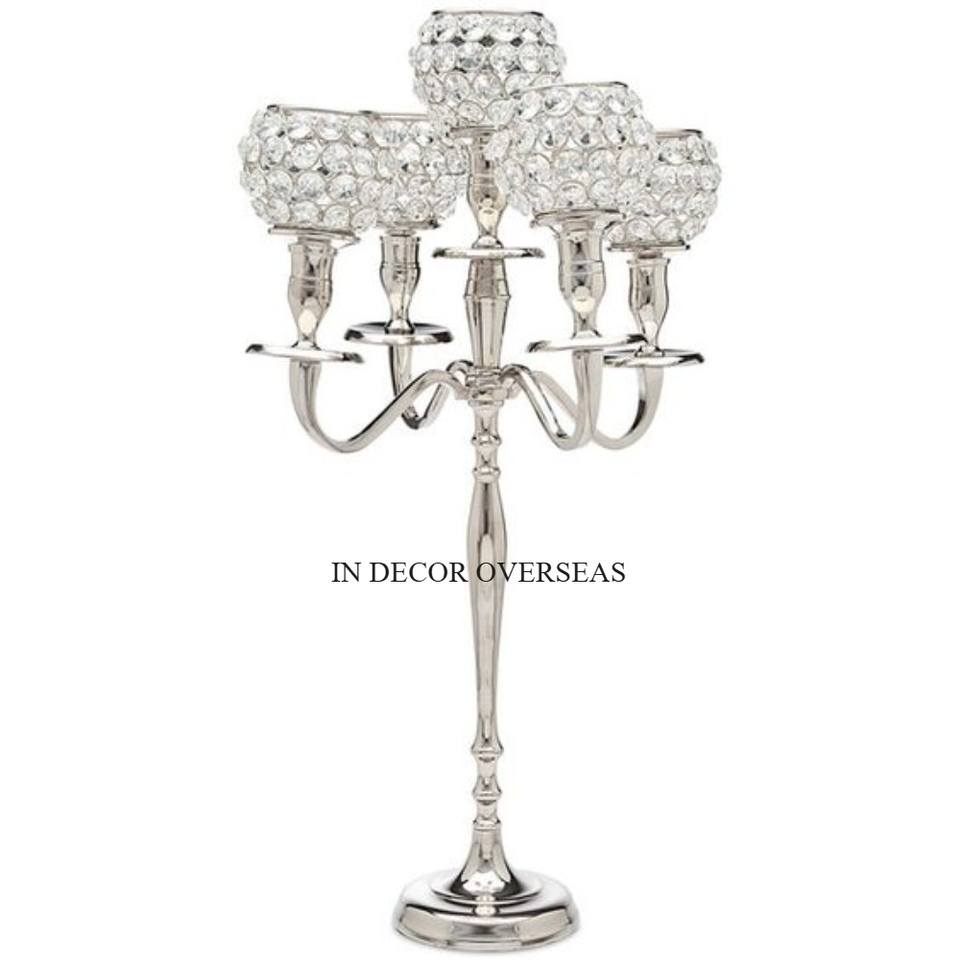 เชิงเทียน5แขนสีเงินเคลือบเงาทำจากอลูมิเนียมเคลือบเงาและใสประดับด้วยลูกปัดคริสตัลสีเงินมีเอกลักษณ์
